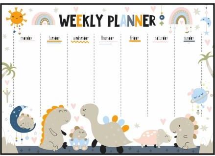 Plan zajęć na 7 dni z rysunkiem wesołych dinozaurów. *PLAKAT NIESPODZIANKA - to dowolny plakat z naszej kolekcji, w dowolnym wymiarze, jednak nie większy niż zamówiony rozmiar. Plakat konfekcjonowany jest losowo, dlatego nazywa się niespodzianka. My również nie wiemy, jaki wzór do Ciebie trafi. Jednak każdy lubi niespodzianki, dlatego możemy śmiało stwierdzić, że to oczekiwanie sprawi niesamowitą radość.