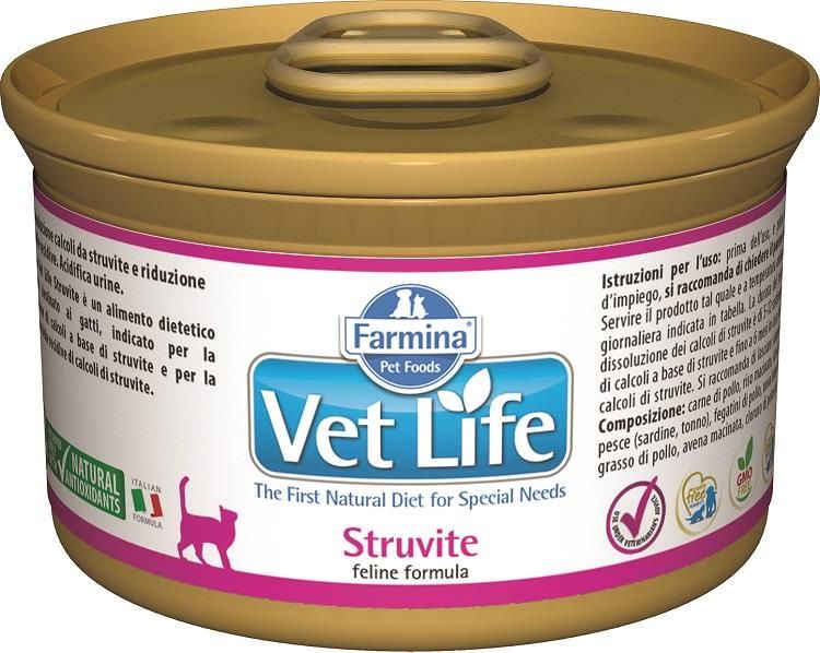 Farmina Vet Life Struvite Przeznaczenie Rozpuszczenie kamieni struwitowych Redukcja nawrotów kamicy struwitowej Farmina Vet Life Struvite to pełnoporcjowa karma dietetyczna dla kotów do rozpuszczania kamieni struwitowych, przy kamicy dolnych dróg moczowych i stosowana w celu ograniczenia powstawania kamieni struwitowych. Charakterystyka Indukuje rozpuszczenie kamieni struwitowych oraz zmniejsza ryzyko nawrotów kamicy struwitowej.Zakwaszenie moczu dzięki zawartości siarczanu wapnia.Obniżona zawartość magnezu ogranicza powstawanie kamieni struwitowych.Obniżona ilość fosforu pomaga kontrolować fosfatemię i zapobiega formowaniu się urolitów.Farmina Vet Life to rewolucyjna i w pełni naturalna linia weterynaryjna. Natura to główna inspiracja filozofii Farminy, co znajduje odzwierciedlenie w naszych dietach. Powstają one po długich i dogłębnych badaniach naukowych, prowadzonych dzięki współpracy z Wydziałem Żywienia Zwierząt Uniwersytetu Fryderyka II w Neapolu.Nasze doświadczenie, zdobyte dzięki rozwijaniu szeregu rozwiązań żywieniowych, dostosowanych do fizjologii psów i kotów, pozwoliło zespołowi Farmina Vet Research opracować pierwszą naturalną linię weterynaryjną. Jej cechy to: Tylko naturalne przeciwutleniacze - bogate w tokoferole ekstrakty naturalnego pochodzenia, które umożliwiają bezpieczną dla zdrowia konserwację produktu.Produkty Farmina Vet Life są pakowane w atmosferze ochronnej, aby zapobiec utlenianiu się tłuszczy i zapewnić długotrwałą świeżość naszych karm.Cruelty Free Research - szacunek jest podstawą naszych badań naukowych. Szczególną cechą protokołów klinicznych stworzonych przez FVR (Farmina Vet Research) jest współpraca z niezależnymi lekarzami weterynarii, pracującymi na terenie całych Włoch. Ich pacjenci, stosując nasze diety i protokoły kliniczne, mają szansą na poprawę swojego stanu zdrowia, przebywając przez cały okres badań ze swoimi rodzinami, z pełnym poszanowaniem dobrostanu zwierząt.ODKRYJ FARMINA VET LIFE, NAJLEPSZE WSPARCIE DLA ZDROWIA TWOJEGO ZWIERZĘCIA. Instrukcja stosowania: przed użyciem zaleca się konsultację z lekarzem weterynarii. Zalecany czas stosowania: 5–12 tygodni w przypadku rozpuszczania kamieni struwitowych i do 6 miesięcy w przypadku ograniczenia powstawania kamieni struwitowych. Podawać w temperaturze pokojowej, zgodnie z dzienną dawką wskazaną w tabeli. Dzienna dawka przedstawiona w załączonej tabeli ma jedynie charakter orientacyjny i wymaga dostosowania do odpowiedniej masy ciała zwierzęcia. Dzienna dawka może różnić się w zależności od rasy, środowiska, aktywności fizycznej i kondycji zwierzęcia. Dzienną dawkę można podzielić na dwa posiłki lub więcej. Zaleca się na początek mieszanie produktu z wcześniej stosowaną dietą. Należy zapewnić zwierzęciu w sposób stały wodę do picia. Po otwarciu przechowywać w lodówce i spożyć w ciągu 48 godzin. Skład: filet z kurczaka, batat, hydrolizowane białko rybne, ryba (sardynka, tuńczyk), wątroba z kurczaka, płynne żółtko jaj, olej z ryb, tłuszcz z kurczaka, nasiona komosy ryżowej ekstrahowane, chlorek potasu, chlorek sodu, siarczan wapnia dwuwodny, włókno grochu, fruktooligosacharydy, ekstrakt z drożdży (źródło mannooligosacharydów), suszone drożdże piwne. Źródła białka: filet z kurczaka, hydrolizowane białko rybne, ryba, wątroba z kurczaka, płynne żółtko jaj. Dodatki w 1 kg - Witaminy, pro-witaminy i chemicznie zdefiniowane substancje o podobnym działaniu: Witamina A (3a672b) 4300JM; Witamina D3 (E671) 170JM; Witamina E (3a700) 160mg. Mieszanki pierwiastków śladowych: Cynk (chelat cynku z hydroksyanalogiem metioniny) (3b6.10): 37.3mg; Mangan (chelat manganu z hydroksyanalogiem metioniny) (3b5.10): 18.7mg; Żelazo [glicynowy chelat żelaza (II) hydrat] (3b108): 3.3mg; Miedź (chelat miedzi z hydroksyanalogiem metioniny) (3b4.10): 3.1mg; Jod (bezwodny jodan wapnia) (3b202): 0.46mg. Aminokwasy, ich sole i podobne produkty: Tauryna (3a370) 1250mg; DL-metionina, czysta technicznie (3c301) 2000mg. Regulatory kwasowości pH moczu: siarczan wapnia dwuwodny 4500mg. Składniki analityczne: białko surowe 10.20%; tłuszcz surowy 5.70%; włókno surowe 0.30%; popiół surowy 2.40%; wilgotność 75.00%; wapń 0.19%; fosfor 0.17%; sód 0.30%; potas 0.20%; magnez 0.019%; chlorki 0.35%; siarka 0.20%; Tauryna 0.15%. Substancja zakwaszająca pH moczu: siarczan wapnia, dwuwodny (4.5g/kg). Przechowuj zamkniętą puszkę w ciemnym i suchym miejscu, z dala od bezpośredniego działania promieni słonecznych. Waga netto, numer partii, numer rejestracyjny fabryki: patrz opakowanie. Wykorzystać przed: patrz data wydrukowana na spodzie opakowania. Wartość energetyczna: ME (CEN) 1130kcal/kg - 4.73MJ/kg
