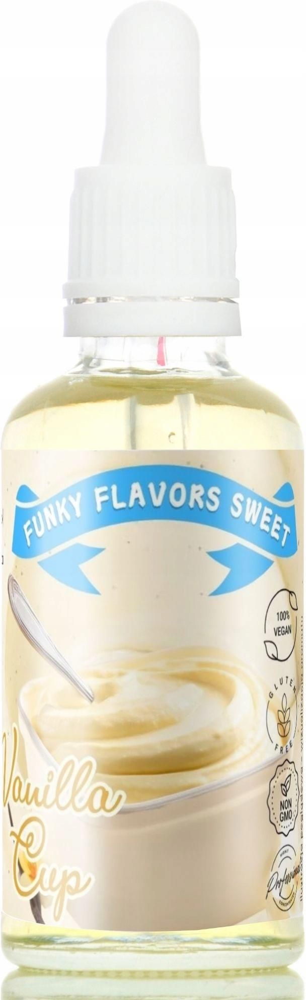 Funky Flavors Sweet Vanilla Cup - słodkie kropelki smakowe bez cukru i kcal Słodzony aromat spożywczy w dużej butelce 50ml z precyzyjnym zakraplaczem. Funky Flavors to skoncentrowane, bezcukrowe, beztłuszczowe aromaty spożywcze idealne do odżywek białkowych, domowych batonów proteinowych, lodów, …
