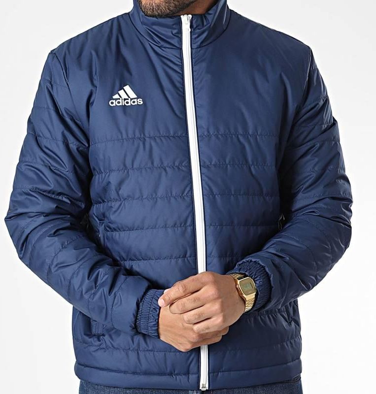 Kurtka Męska adidas Entrada 22 Light IB6071 Kurtka męska adidas pozwoli prezentować piłkarski styl niezależnie od tego dokąd się wybierasz. Pikowana konstrukcja z równomiernie rozłożonym, syntetycznym wypełnieniem oferuje odpowiednią ochronę przed zimnem, co szczególnie docenisz podczas aktywności na świeżym powietrzu. Jednokolorowy, granatowy koncept oferuje wszechstronne możliwości tworzenia sportowych zestawień, a subtelne logo eksponuje wysoką jakość na jaką stawia producent. Standardowy krój swobodnie układa się na sylwetce nie krępując naturalnego zakresu ruchów. Zamek na całej długości ułatwi ubieranie, a niezbędne drobiazgi bezpiecznie przechowasz w zapinanych kieszeniach bocznych. Elastyczne gumki przy mankietach zapobiegają podwiewaniu chłodnego powietrza i stabilizują rękawy na właściwym miejscu. Kurtka adidas tworzy dodatkową barierę od zimna, materiał: 100% poliester z recyklingu wypełnienie: 90% poliester z recyklingu / 10% poliester kolor: granatowy