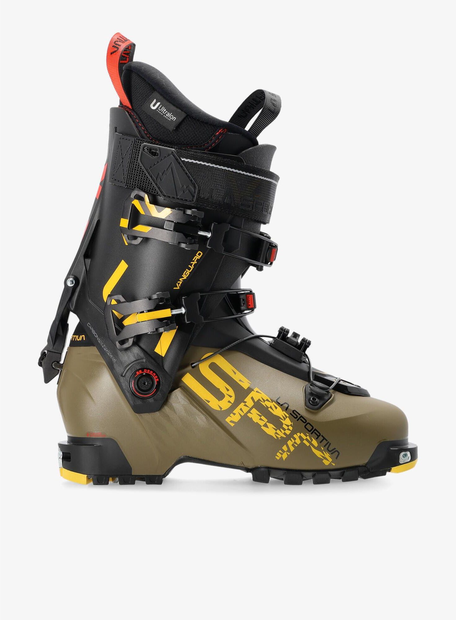Buty skiturowe La Sportiva Vanguard - turtle/yellow to zaawansowany model, który z pewnością spisze się wśród wymagających ski alpinistów. Ich funkcjonalność oraz komfort noszenia pozwolą także na techniczne zjazdy, wypad na skitury, czy szybki free ride. Buty skiturowe La Sportiva Vanguard - turtle/yellow to przede wszystkim wysoka odporność na uszkodzenia mechaniczne uzyskana za sprawą tworzywa PEBAX® Rnew® bio-based, z którego wykonano cholewkę oraz kołnierz butów. Zastosowanie tego materiału pozwoliło także na zmniejszenie ich wagi, co pozwala na pokonywanie dłuższych i bardziej wymagających podejść. Ruchomość cholewki w 68° w trybie chodzenia sprawia, że możesz swobodnie pokonywać strome wzniesienie bez uczucia zmęczenia stóp i bolesnych otarć. Każdy element konstrukcji modelu powala na precyzję, oraz odpowiednie przełożenie mocy na narty. Serce modelu to skorupa Pebax® Shell z asymetrycznym zapięciem mankietu V-SHAPE™. To połączenie mobilności z intuicyjnym dopasowaniem. Całość jest łatwa w zakładaniu, co znacząco wpływa na komfort użytkowania. Buty skiturowe La Sportiva Vanguard - carbon/yellow wzmocniono karbonem w wersji męskiej, co pozwoliło na uzyskanie dużej sztywności (FLEX=130). Podwójny język EZ Flex™ zbudowano w oparciu o dwie sztywności, chcąc zapewnić maksimum mobilności w trybie chodzenia oraz maksimum mocy w trybie zjazdu. O izolację termiczną dba wyjmowana wkładka WarmSole™ wykonana z izolującego poliuretanu. Optymalne i szybkie dopasowanie uzyskasz dzięki 2-klamrowemu systemowi EASY 2 WEAR z paskiem do mikro regulacji. System Spider Buckle Evo™ zapewnia optymalne rozłożenie naprężenia na całej powierzchni języka, a tą dwupozycyjną klamrę możesz ustawić adekwatnie do podchodzenia lub zjazdu. Opatentowana konstrukcja języka EZ Flex™ pozwala na swobodny ruch stopy dzięki specjalnemu zawiasowi pomiędzy górną a dolną częścią buta. System szybkiej zmiany trybów Ski/Walk to EZ-LOCK™, który został umiejscowiony z tyłu i zapobiega uszkodzeniom mechanicznym innych części buta. Wewnątrz modelu znajduje się liner odpowiadający za komfort oraz termikę podczas zjazdów. Zaprojektowana w oparciu o ergonomiczny kształt skorupy. Wykorzystanie materiałów o zróżnicowanej grubości oraz wykorzystanie pianki Ultralon® Performance pozwoliło na uzyskanie wygodnego modelu, który jest maksymalnym wsparciem dla Twojej stopy. Buty skiturowe La Sportiva Vanguard - carbon/yellow posiadają podeszwę zewnętrzna Vibram® V-LUGS™ o podwyższonej przyczepności i odporności na ścieranie, wyposażoną w wyjątkowo trwałe wstawki na pięcie oraz palcach. Buty La Sportiva Vanguard - turtle/yellow - najważniejsze cechy:Model dedykowany do aktywności typu Tour, łączącej wymagające podejścia z satysfakcjonującymi zjazdami;Szeroki zakres ruchów cholewki - 68°;Cholewka i kołnierz wykonane z materiału PEBAX® Rnew® 1100;EZ Flex™ Double Tongue: wykonany z dwóch elementów o różnej grubości, dla komfortu jazdy;Regulacja nachylenia w 2 pozycjach: 12°, 14°.Wyjmowana wkładka WarmSole™ zapewnia znakomity poziom izolacji termicznej;Tylny system zamykania EZ-LOCK™ umożliwia szybkie przejście między trybami Ski/Walk;3 klamry;Dodatkowe zapięcie na rzep TWIN-PWR™: pozwalające na dodatkową regulację napięcia cholewki;Podeszwa zewnętrzna Vibram® V-LUGS™;Wewnętrzny botek Vanguard LINER zapewnia swobodę ruchów i izolację.