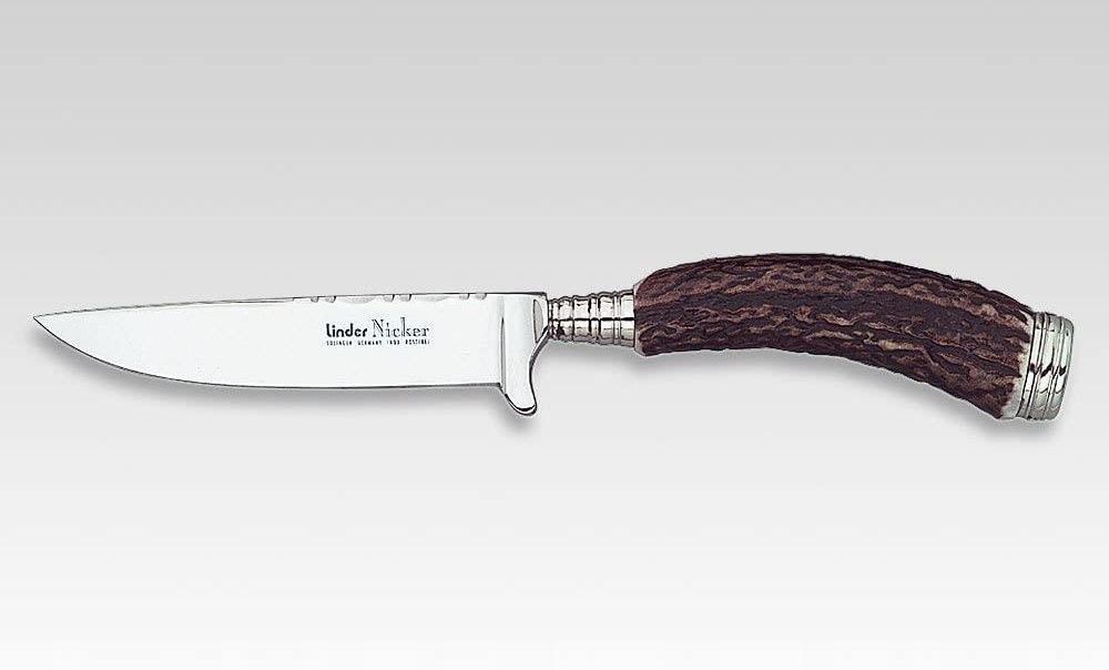 Linder 242410 Tradycyjny nóż z rękojeścią wykonaną z rogu jelenia. 10 cm ostrze ze stali nierdzewnej 420 z ozdobnym grzbietem. Długość całkowita 22,5 cm W zestawie pochwa.