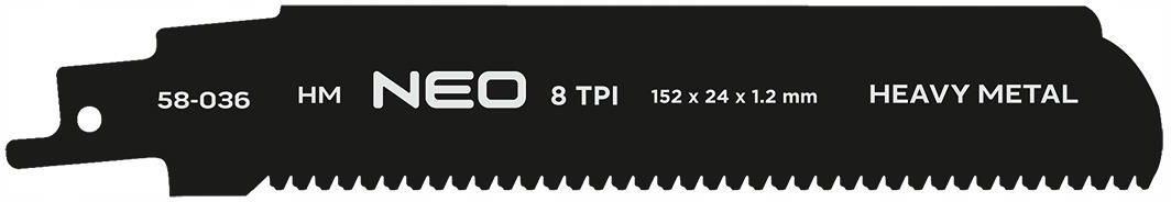 Brzeszczot NEO TOOLS 58-036 1 szt. Brzeszczot do piły szablastej z uzębieniem z węglika spiekanego (HM), o wymiarach 152 x 24 x 1.2 mm i podziałce 8 TPI, zaprojektowany do prostych cięć metalu w zakresie 5–100 mm.