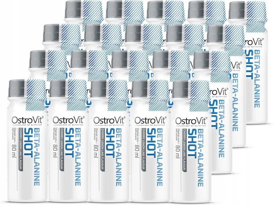 OstroVit Beta-Alanina Shot 80 ml OstroVit Beta-Alanina Shot to wysokiej jakości suplement diety, który stanowi źródło beta-alaniny. To preparat o pysznym, wiśniowo-cytrynowo-limonkowym smaku, dostępny w postaci shota, który nie zawiera dodatku cukru. To produkt stworzony z myślą o sportowcach i osobach aktywnych fizycznie, którym zależy na uzupełnieniu diety w cenny składnik. 1600 Mililitrów w zestawie 80 Porcji w zestawie 20 Mililitrów 1 porcja = 20 mililitrów Bogate źródło beta-alaniny - jedna porcja suplementu diety dostarcza do organizmu 800 mg wartościowego związku. Pyszny wariant smakowy - wiśniowo-cytrynowo-limonkowa kompozycja zachwyca podniebienie i zapewnia wyjątkowe doznania. Bez dodatku cukru - suplement diety zawiera niskoenergetyczne substancje słodzące, co przyczynia się do obniżenia kaloryczności produktu. 1 porcja = 4 łyżeczki = 20 ml. Wydajność - jeden shot zawiera 4 porcje preparatu. Wygodna forma - produkt dostępny w postaci shota zapewnia bezproblemową podaż suplementu diety i świetnie sprawdzi się wśród osób, które mają trudności z połykaniem tabletek. Poręczne opakowanie możesz zabrać zawsze ze sobą i spożyć suplement w dowolnym miejscu i czasie. OstroVit Beta-Alanina Shot - pyszne źródło cennego składnika Beta-alanina to organiczny związek chemiczny zaliczany do aminokwasów endogennych, który wraz z L-histydyną stanowi prekursor karnozyny - niezwykle istotnego wśród osób aktywnych fizycznie dwupeptydu, który w ustroju występuje głównie w komórkach mięśniowych. Beta-alanina może być naturalnie syntetyzowana w organizmie człowieka, a także może być dostarczana do ustroju wraz z codzienną dietą - za źródła związku uznaje się przede wszystkim mięso i produkty mięsne. Jakość potwierdzona laboratoryjnie W trosce o zdrowie naszych klientów, produkty przez nas wytwarzane poddawane są regularnym badaniom w niezależnym akredytowanym laboratorium, w celu zapewnienia i utrzymania najwyższej jakości. OstroVit Beta-Alanina Shot 80 ml - Badanie mikrobiologiczne 17.10.2023OstroVit BETA-ALANINE SHOT - Badanie metale ciężkie 22.03.2021OstroVit BETA-ALANINE SHOT - Badania mikrobiologiczne 19.03.2021