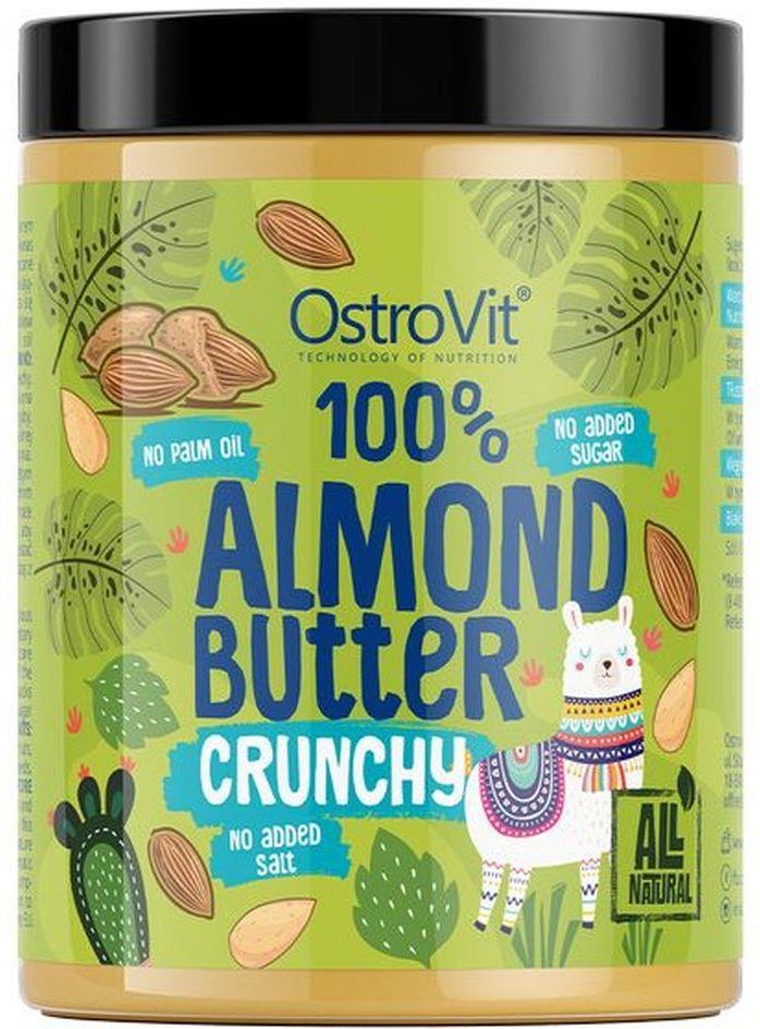 OstroVit 100% Masło Migdałowe 1000 g PASTA CRUNCHY Typ: crunchy Żywność dietetyczna OstroVit 100% Almond Butter ⭐️ to pyszny krem pozyskiwany z migdałów, który stanowi m.in. źródło białka i niezbędnych nienasyconych kwasów tłuszczowych (NNKT). Nie zawiera dodatku cukru i soli, a jego unikalny smak sprawia, że świetnie sprawdza się zarówno jako dodatek do dań na słodko, jak i na wytrawnie. To produkt polecany w szczególności osobom dbającym o smukłą sylwetkę, a także sportowcom. Stworzony w 100% z migdałów. Źródło cennych składników - produkt zawiera łatwo przyswajalne białko, niezbędne nienasycone kwasy tłuszczowe, a także błonnik pokarmowy, witaminy i składniki mineralne. Zawiera kawałki chrupiących migdałów i wyróżnia się niejednolitą konsystencją. Bez dodatku soli. Bez dodatku cukru. Bez oleju palmowego. Odpowiedni dla wegetarian i wegan - produkt nie zawiera składników pochodzenia zwierzęcego. Masa netto produktu: 1000 g Ilość porcji w opakowaniu: 40 Wielkość porcji: 25 g Wartości odżywcze na 100 g, w 1 porcji, % RWS* Wartość energetyczna 2586 kJ / 626 kcal, 647 kJ / 157 kcal, 8 Tłuszcz 53 g, 13 g, 19 - w tym kwasy tłuszczowe nasycone 4.2 g, 1.1 g, 6 Węglowodany 6.1 g, 1.5 g, 1 - w tym cukry 4.4 g, 1.1 g, 1 Białko 25 g, 6.3 g, 13 Sól 0.03 g, 0.01 g, - *RWS - Referencyjna wartość spożycia Składniki:Migdały prażone 100% Produkt może zawierać inne orzechy, orzeszki arachidowe, mleko (łącznie z laktozą), soję, nasiona sezamu, owies, jaja, skorupiaki, ryby. Jak spożywać 100% Almond Butter Spożywać w zależności od zapotrzebowania. Nie spożywać w przypadku uczulenia na którykolwiek ze składników produktu. OstroVit 100% Krem Migdałowy - wartościowe i smaczne uzupełnienie diety Krem orzechowy, zwany również kremem migdałowym, to produkt wytwarzany z nasion migdałowca pospolitego - rośliny wieloletniej z rodziny różowatych, którą naturalnie można spotkać w krajach basenu Morza Śródziemnego, choć jej głównym producentem jest USA. Potocznie migdały są określane mianem „króla orzechów”, jednak tak naprawdę nie są orzechami. Stanowią za to wartościowe źródło cennych składników - jednonienasyconych i wielonienasyconych kwasów tłuszczowych, białka, błonnika pokarmowego, a także witamin i składników mineralnych. OstroVit 100% Krem Migdałowy to produkt o niejednolitej konsystencji, który zawiera kawałki chrupiących migdałów i świetnie sprawdzi się zarówno jako dodatek do dań na słodko, jak i na wytrawnie. To nietuzinkowe uzupełnienie diety sportowców, a także osób dbających o szczupłą sylwetkę, które nie zawiera zbędnych składników i wolne jest od dodatku cukru oraz soli.