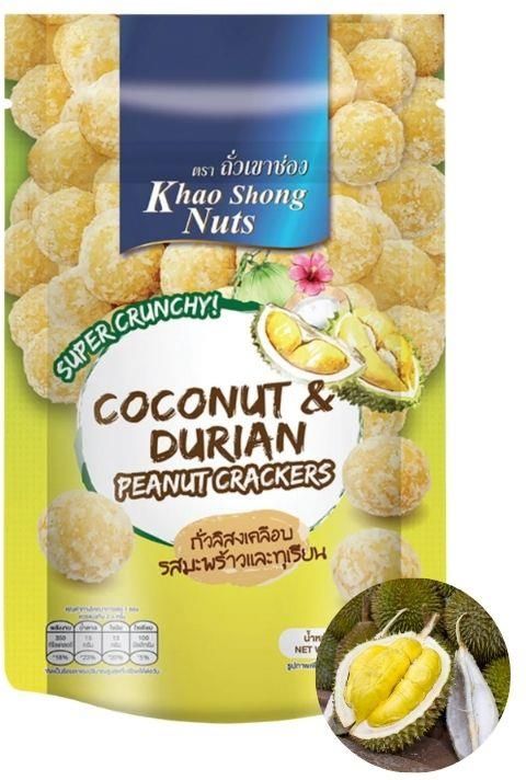 Super prażone orzeszki ziemne w chrupiącej otoczce z kokosa z durianem . Orientalna mega chrupiąca przekąska z egzotyczną śmierdzącą mąka z owoca durian. Spróbuj zaskakujących przekąsek azjatyckich. 75g