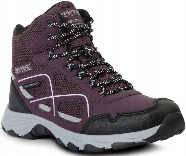 Damskie buty trekkingowe firmy REGATTA Model: LADY VENDEAVOUR kod produktu: RWF807 kolor: SZARY/FIOLETOWY/CZARNY Damskie buty trekkingowe VANDEVOUR - wodoodporne i wygodne. Wykonane z membrany ISOTEX z uszczelnionymi szwami ochronią przed deszczem i zachlapaniem. Dzięki oddychającemu materiałowi stopy pozostają świeże podczas długich wędrówek. Wycinana wkładka EVA zapewnią komfort przez cały dzień. Antypoślizgowa podeszwa wyposażona w bieżnik gwarantuje świetną przyczepność do podłoża. Sprawdzą się zarówno w górskim terenie, na leśnych ścieżkach jak i w codziennym użytkowaniu. PARAMETRY TECHNICZNE Materiał: 52% Poliuretan, 48% Poliester, wygodna wkładka EVA, Wodoodporność 3.000mm, uszczelnione szwy z oddychającą wewnętrzną wyściółką membranową, wzmacniane noski, język zszyty z cholewką Isotex: Wodoodporna, oddychająca i wiatroodporna technologia membranowa