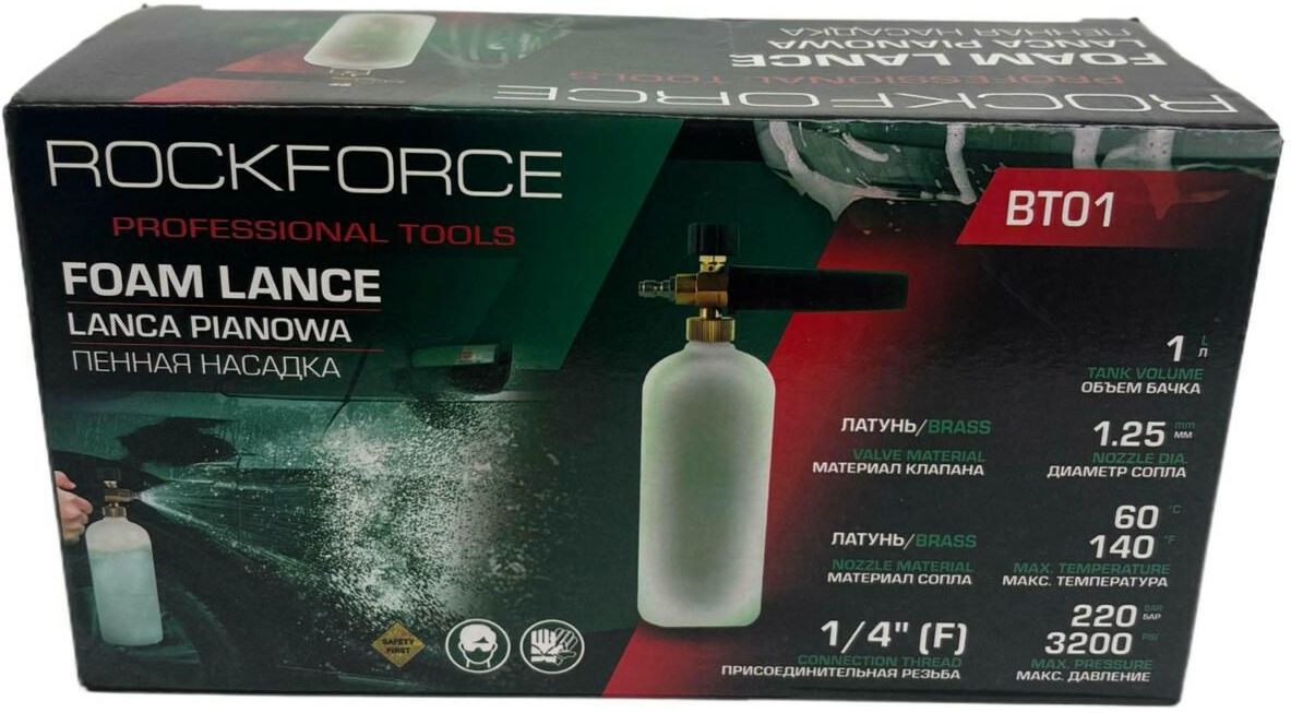 ROCKFORCE Pianownica ŚREDNICA DYSZY 1,25mm POJEMNOŚĆ ZBIORNIKA 1L PRZEPŁYW WODY do 3200L/H Szczegóły produktu Marka: ROCKFORCE Kod: 65673 (RF-BT01) Dysza pianowa Rockforce BT01 to wysokiej jakości akcesorium przeznaczone do myjek wysokociśnieniowych, które pozwala uzyskać gęstą, obfitą pianę niezbędną w procesie skutecznego mycia samochodów, motocykli, rowerów czy elementów małej architektury ogrodowej. Dzięki zastosowaniu mosiężnych komponentów (zaworu i dyszy), butelki o pojemności 1 litra oraz regulowanej głowicy, lanca pianowa zapewnia niezawodność i doskonałe efekty czyszczenia. Najważniejsze cechy produktu Pojemność zbiornika 1 litr – odpowiednia do przygotowania środka pianotwórczego do pełnego mycia pojazdu. Mosiężne elementy konstrukcyjne – zawór i dysza wykonane z mosiądzu gwarantują trwałość i odporność na wysokie ciśnienie oraz częstą eksploatację. Średnica dyszy 1,25 mm – optymalny przepływ piany zapewniający jej równomierne i gęste rozprowadzenie na powierzchni. Zakres pracy temperatury: max 60°C – możliwość stosowania zarówno wody zimnej, jak i podgrzanej. Maksymalne ciśnienie robocze: 220 bar – kompatybilna z profesjonalnymi myjkami wysokociśnieniowymi. Przepływ wody: do 3200 l/h – stabilna i równomierna praca nawet przy dużej wydajności myjki. Gwint przyłącza: 1/4" (F) – uniwersalne mocowanie do większości popularnych modeli myjek. Regulowana głowica – umożliwia dostosowanie strumienia piany do indywidualnych potrzeb. Zalety ciśnieniomierza Gęsta, trwała piana – lepsza penetracja brudu i skuteczniejsze zmiękczanie zanieczyszczeń. Profesjonalna jakość – solidna konstrukcja i mosiężne elementy zapewniają długą żywotność. Oszczędność środków chemicznych – precyzyjne dozowanie detergentu pozwala zmniejszyć jego zużycie. Uniwersalne zastosowanie – idealna do samochodów, motocykli, rowerów, przyczep, kostki brukowej, elewacji i innych powierzchni. Bezpieczne mycie bez ryzyka zarysowań – piana rozpuszcza brud jeszcze przed myciem właściwym, co minimalizuje ryzyko uszkodzeń lakieru. Łatwa obsługa i montaż – szybkie podłączenie do myjki i prosty system regulacji strumienia. Pianownica Rockforce sprawdzi się w myciu samochodów osobowych i dostawczych, pielęgnacji motocykli, quadów i rowerów, czyszczeniu elewacji, tarasów i kostki brukowej, zastosowaniach profesjonalnych w myjniach i warsztatach. Dlaczego warto? Wybierając model Rockforce BT01, stawiasz na profesjonalizm, trwałość i skuteczność. To akcesorium, które pozwala osiągnąć efekty porównywalne z myjniami samochodowymi, a przy tym jest wygodne w użyciu i oszczędne w eksploatacji. Rockforce to marka premium, specjalizująca się w wysokiej jakości narzędziach ręcznych, warsztatowych oraz wyposażeniu serwisowym. Produkty tej marki zostały zaprojektowane z myślą o najbardziej wymagających użytkownikach — profesjonalnych warsztatach samochodowych, serwisach przemysłowych oraz ambitnych majsterkowiczach, którzy oczekują niezawodności i najwyższej precyzji wykonania.