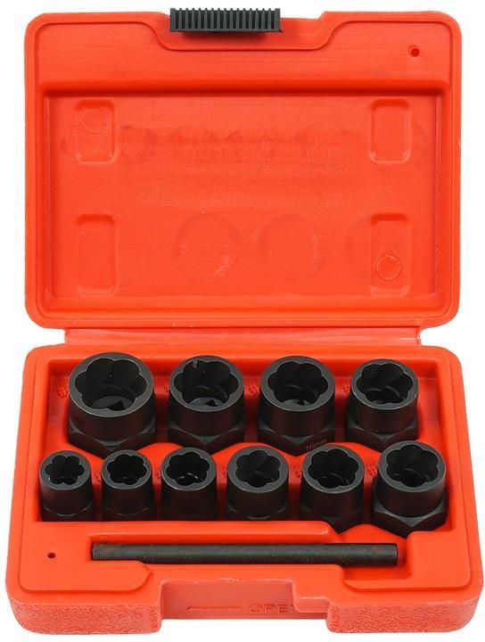 WYKRĘTAKI DO URWANYCH I ZNISZCZONYCH ŚRUB I NAKRĘTEK 3/8" Specjalistyczny zestaw do trudnych przypadków – Nasze wykrętaki 3/8" zostały zaprojektowane, aby skutecznie wykręcać zerwane, obrobione lub zniszczone śruby i nakrętki. To nieocenione narzędzie w warsztatach samochodowych, serwisach mechanicznych oraz przydomowych projektach naprawczych. Precyzja i wytrzymałość – Nasadki wykonano z podwójnie hartowanej stali, co zapewnia odporność na odkształcenia i długotrwałą trwałość, nawet przy intensywnej eksploatacji. Cechy produktu Kompletny zestaw nasadek 3/8" – W skład zestawu wchodzą nasadki o rozmiarach: 9 mm, 10 mm, 11 mm, 12 mm, 13 mm, 14 mm, 15 mm, 16 mm, 17 mm, 19 mm oraz pin 7×90 mm, co pozwala dopasować narzędzie do większości zerwanych lub obrobionych śrub i nakrętek. Specjalny kształt wewnętrzny nasadki – Każda nasadka została tak zaprojektowana, aby wgryzać się w główkę obrobionej śruby lub nakrętki, zapewniając pewne zakleszczenie i umożliwiając skuteczne wykręcenie. Zewnętrzna budowa nasadki – Dzięki sześciokątnej lub płasko-oczkowej konstrukcji nasadki można używać zarówno z kluczem płasko-oczkowym, jak i standardowymi nasadkami 6-kątnymi. Walizka z przegródkami – Zestaw dostarczany jest w praktycznym etui, które ułatwia transport i przechowywanie, zapewniając porządek i szybki dostęp do odpowiedniej nasadki. Zalety Wysoka skuteczność – Dzięki precyzyjnemu wykonaniu nasadki doskonale chwytają nawet mocno zniszczone śruby, co minimalizuje ryzyko dalszego uszkodzenia i zwiększa efektywność pracy. Trwałość i odporność – Podwójne hartowanie stali sprawia, że narzędzie zachowuje swoją wytrzymałość przez wiele lat, nawet przy intensywnym użytkowaniu w warsztacie czy serwisie samochodowym. Wszechstronność zastosowania – Zestaw sprawdzi się w naprawach samochodowych, montażach maszyn, pracach mechanicznych, a także przy projektach DIY w domu. Zastosowanie Wykręcanie zerwanych, obrobionych lub zniszczonych śrub i nakrętek. Idealne w serwisach samochodowych, warsztatach mechanicznych oraz punktach naprawczych. Doskonałe do prac wymagających precyzji – nie należy używać z kluczami udarowymi, aby nie uszkodzić nasadki ani elementu obrabianego. Umożliwia bezpieczne i szybkie odzyskanie części, które standardowe narzędzia nie są w stanie wykręcić. Podwójnie hartowana stal dla maksymalnej trwałości Nasadki zostały wykonane z wysokiej jakości stali poddanej podwójnemu hartowaniu, co znacząco zwiększa odporność na odkształcenia, złamania i ścieranie. Dzięki temu zestaw zachowuje swoją wytrzymałość nawet przy wielokrotnym wykręcaniu trudnych śrub, co czyni go narzędziem niezawodnym w profesjonalnych warsztatach i serwisach mechanicznych. Specjalny kształt wewnętrzny nasadki Wewnętrzna konstrukcja nasadek została zaprojektowana tak, aby „wgryzać się” w łeb obrobionej śruby lub nakrętki, zapewniając pewne zakleszczenie. To pozwala na skuteczne wykręcanie nawet mocno zniszczonych elementów, minimalizując ryzyko dalszego uszkodzenia oraz zwiększając precyzję i bezpieczeństwo pracy.