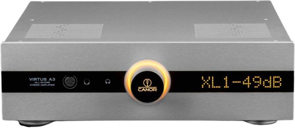Virtus A3 to wszechstronny wzmacniacz All-in-One klasy A/AB w układzie dual mono, łączący w jednej obudowie: wzmacniacz mocy, przedwzmacniacz gramofonowy, wzmacniacz słuchawkowy oraz przetwornik cyfrowo-analogowy (DAC). Najważniejsze cechy – All-in-One – przedwzmacniacz gramofonowy, wzmacniacz słuchawkowy, hybrydowy wzmacniacz zintegrowany klasy A/AB oraz DAC – Unikalna topologia wzmacniacza – połączenie wysokiej jakości brzmienia klasy A z niskim poborem mocy klasy AB – Sterowanie dotykowe – rewolucyjna forma interakcji z urządzeniem marki CANOR Główne funkcje W pełni dyskretny układ dual mono Niezależność torów dla lewego i prawego kanału zapewnia wyjątkową separację kanałów i minimalne przesłuchy. Efektem jest krystalicznie czysty dźwięk stereo z doskonałą przestrzenią i realizmem. Innowacyjny stopień wyjściowy Hybrydowy wzmacniacz mocy klasy A/AB łączy lampowy stopień wstępny klasy A, który stale kontroluje głośnik, z potężnym stopniem wyjściowym klasy AB odpowiadającym za prąd. To kompromis łączący finezję klasy A z mocą klasy AB. Dotykowy ekran sterujący 1,3-calowy ekran dotykowy LCD zapewnia pełną kontrolę nad wszystkimi funkcjami urządzenia. Intuicyjna nawigacja dotykowa gwarantuje wygodę i precyzję obsługi. Zaawansowany system chłodzenia System chłodzenia z wykorzystaniem rur cieplnych (heatpipe) i wolnoobrotowych wentylatorów skutecznie odprowadza ciepło z elementów mocy. Rozwiązanie to jest rzadkością w audio i zapewnia cichą, stabilną pracę nawet przy dużym obciążeniu. Precyzyjne pokrętło sterujące Zastosowano system wykrywania pozycji CCD (Charge-Coupled Device), który pozwala na bezstykowe, płynne i trwałe sterowanie głośnością oraz menu – znacznie bardziej zaawansowane niż klasyczne enkodery. Płaska cewka wyjściowa Własnoręcznie zaprojektowana, płaska cewka w stopniu wyjściowym poprawia integralność sygnału, jednocześnie eliminując potencjalne zniekształcenia. Galwaniczne odseparowanie wejścia USB Wejście USB zostało galwanicznie odizolowane od układu audio w celu wyeliminowania pętli mas i zakłóceń z komputera. Dodatkowo sygnał USB jest rekonfigurowany względem lokalnego zegara o niskim szumie fazowym, co minimalizuje jitter. Dodatkowe cechy – Cztery urządzenia w jednej obudowie: hybrydowy wzmacniacz mocy klasy A/AB, przedwzmacniacz gramofonowy, wzmacniacz słuchawkowy oraz DAC – Tor analogowy i cyfrowy w konfiguracji dual mono z niezależnym, wieloetapowym zasilaniem dla każdego kanału – Dyskretny przedwzmacniacz gramofonowy z obsługą wkładek MM i MC – Dyskretny, w pełni zbalansowany wzmacniacz słuchawkowy z wyjściami zbalansowanymi i niezbalansowanymi – Wyjścia liniowe klasy A (zbalansowane i single-ended) – możliwość podłączenia końcówek mocy lub aktywnych kolumn/subwoofera – Efektywny system chłodzenia z radiatorami typu heatpipe – Pokrętło sterujące osadzone w precyzyjnym podwójnym łożysku kulkowym – Dotykowy wyświetlacz wbudowany w pokrętło – wygodny dostęp do ustawień i funkcji