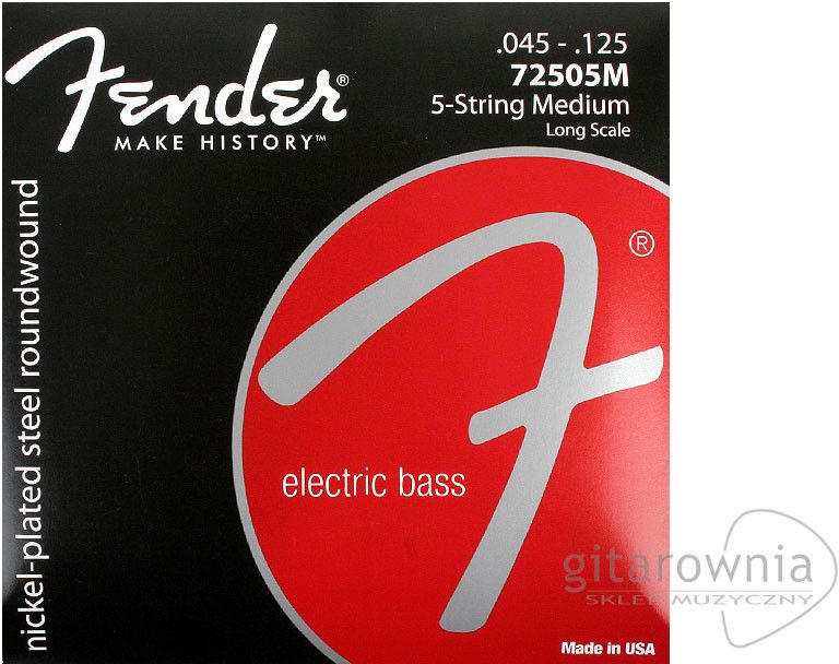 Struny do gitary basowej Fender 7250-5M 45-125 Fender 7250 łączą wysoką wydajność i dynamiczny dźwięk stali z gładkim dotykiem niklu. Te okrągłe struny są jasne i mocne i idealnie nadają się do rocka, bluesa i nie tylko. Nie ma lepszego sposobu, aby zabłyśnąć swoją osobowością na basie, niż ten bardzo wyrazisty zestaw strun. 7250-5M: .045, .065, .085, .105, .125