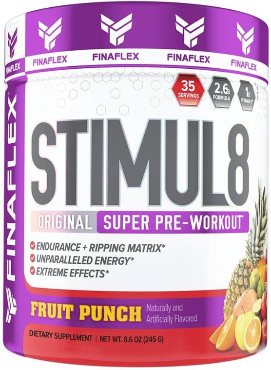 Finaflex Stimul8 Fruit Punch 245g Najważniejsze cechy Finaflex Stimul8 Fruit Punch 245g: unikalna kompozycja witaminy C, wapnia, potasu, beta-alaniny, kofeiny, ekstraktu z nasion Kakaowca, L-fenyloalaniny, ekstraktu z liści Guayusa, teakryny i wyciągu z korzenia Rauwolfia vomitoria wapń przyczynia …