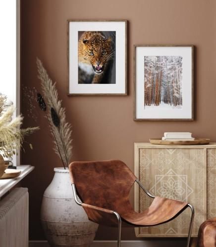 Zestaw 2 plakatów z zimowymi obrazami - zaśnieżonymi drzewami oraz zimowym lampartem. Do plakatów nie są dołączone ramki.