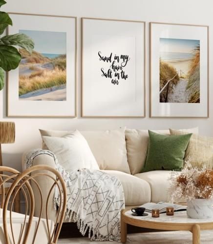 Zestaw 3 letnich plakatów nawiązujących do wypoczynku nad morzem. 2 plakaty są fotografią nadmorskiego brzegu, natomiast 1 czarno-biały plakat zawiera napis. Do plakatów nie są dołączone ramki.