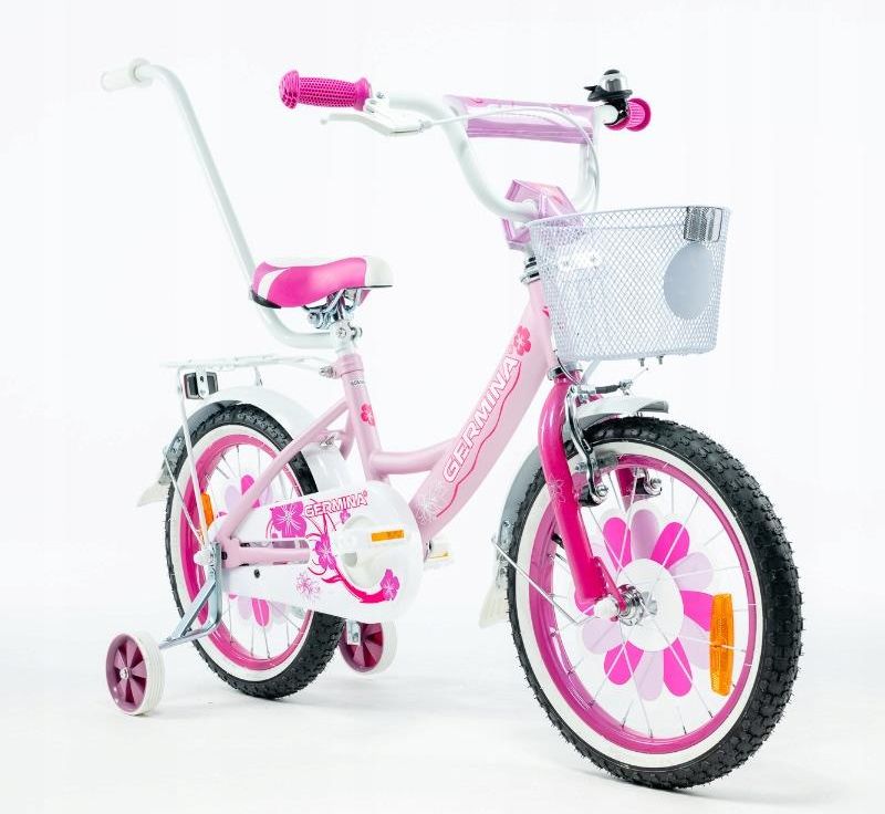 Germina Różowy Rowerek Dziecięcy 16" Dla Dziewczynki Z Koszykiem I Kółkami Bocznymi Suraż