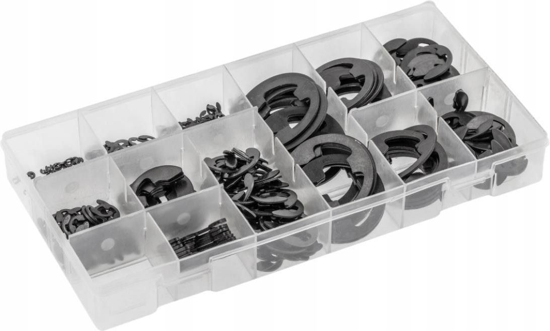 Opis produktu Stalowe zawleczki typy „E” mają zastosowanie przy szybkim zabezpieczaniu elementów mocowań i zawieszeń. Wykorzystywane są w warsztacie, motoryzacji i serwisach. Charakterystyka stalowe; 9 rozmiarów; zapakowane w wygodne pudełko z przegródkami. Zestaw zawiera sprężynki rozprężne: Średnica wew. fi 1,5 mm 30 szt. fi 3 mm 30 szt. fi 5 mm 40 szt. fi 6 mm 50 szt. fi 10 mm 50 szt. fi 12 mm 40 szt. fi 15 mm 20 szt. fi 19 mm 20 szt. fi 22 mm 20 szt.