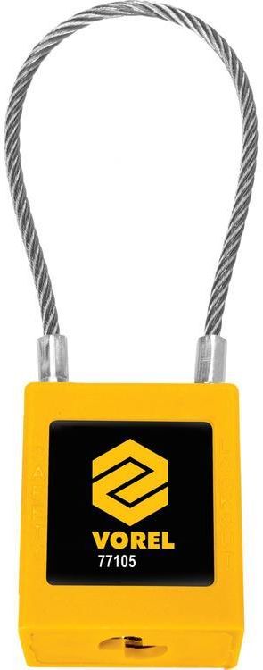 Kłódka posiada mocny hartowany pałąk oraz żeliwny korpus. Kłódka polwekana żółta, przeznaczona do ogólnych zastosowań oraz zabezpieczeń mienia. Odporna na warunki atmosferyczne, trudna do przecięcia i uszkodzenia. Jarzmo elastyczne wykonane z nierdzewnej linki stalowej fi 3,2 mm x 175mm, wysokość pętli jarzma wynosi 85 mm wymiary korpusu 39,5 x 20 x 45 mm. W zestawie są 2 klucze z frezowanym niecentrycznym kanałem. VOREL – produkty przeznaczone dla użytkowników ceniących funkcjonalność i przystępną cenę. Dedykowane głównie do użytku przez majsterkowiczów „DIY” oraz w gospodarstwach domowych. Cechują się zbilansowaną równowagą ceny i jakości. Wśród oferowanych produktów znajduje się szeroki zakres narzędzi budowlanych i warsztatowych, artykuły pomiarowe i elektrotechniczne, akcesoria do elektronarzędzi oraz akcesoria samochodowe. Dane techniczne: Ilość kluczy [szt.]: 1 Rozmiar [mm]: 45x20x39 Wykończenie: mosiądz Kolor: żółty