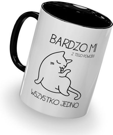 Zabawny kubek z kotem i napisem "bardzo mi z tego powodu wszystko jedno". Świetny prezent dla właścicieli mruczków.
