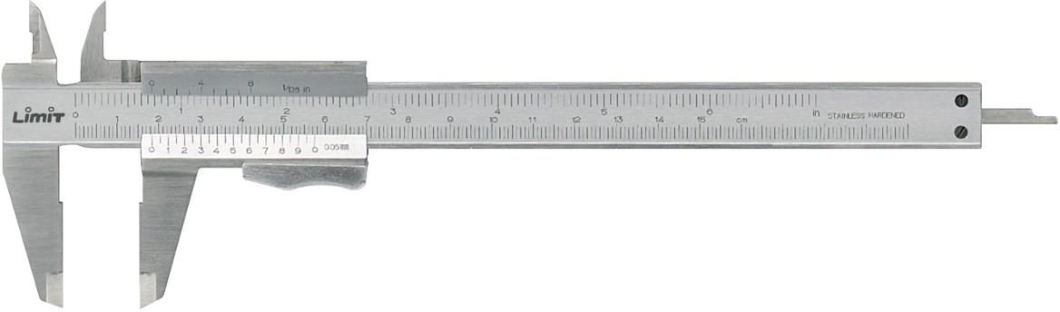 LIMIT Suwmiarka analogowa 150 mm: 4-funkcyjna. Ze stali nierdzewnej. Hartowana. Powierzchnie z podziałkami są chromowane na mat. Podziałka w mm i calach. Noniusz o dokładności 1/20 i 1/128", i długości 39 mm. Z głębokościomierzem i szczękami do pomiarów wewnętrznych. DIN 862. Dane techniczne: Jednostka miary: mm, cale Wykonanie: analogowy Dokładność: ±0.05 mm Rozdzielczość: 0.05 mm Długość pomiarowa: 150 mm Blokada: przycisk blokujący Norma: DIN 862 Długość szczęk pomiar zewnętrzny: 38 mm Do każdej suwmiarki Limit dołączony jest certyfikat kontroli jakości.