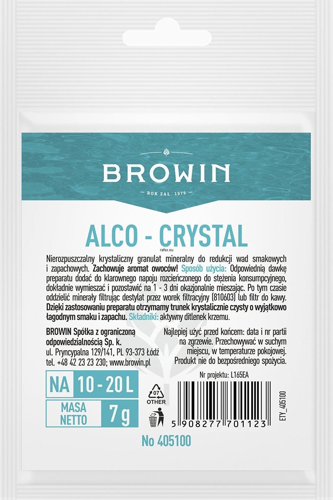 Alco-crystal jest to środek służący do poprawy smaku i aromatu spirytualiów. Skutecznie koryguje niechciane aromaty wódek, destylatów i win zachowując przy tym nutę owocową. Alco-crystal to drobny, nierozpuszczalny granulat mineralny służący do redukcji wad smakowych i zapachowych alkoholi. Dzięki zastosowaniu preparatu otrzymamy krystalicznie czysty trunek o wyjątkowo łagodnym smaku i zapachu. Istotne cechy: · Gramatura 7 g · Na 10-20 l alkoholu · Poprawia smak i zapach alkoholu Sposób użycia Dawkę preparatu dodaj do klarownego alkoholu rozcieńczonego do stężenia konsumpcyjnego w ilości 7 g na 10-20 litrów alkoholu, dokładnie wymieszaj i pozostaw na 1-3 dni, okazjonalnie mieszając. Po tym czasie oddziel preparat, filtrując alkohol przez worek filtracyjny lub filtr do kawy. Składniki: · aktywny ditlenek krzemu Wymiary opakowania: · długość: 7,2 cm · szerokość: ok 0,4 cm · wysokość: 10,8 cm Uwaga! Zasady wyrobu alkoholu na terenie RP regulują ustawy: z dn. 02.03.2001 r. o wyrobie alkoholu etylowego oraz wytwarzaniu wyrobów tytoniowych: z dn. 12.05.2011 r. o wyrobie i rozlewie wyrobów winiarskich, obrocie tymi wyrobami i organizacji rynku wina oraz z dn. 18.10.2006 r. o wyrobie napojów spirytusowych oraz o rejestracji i ochronie oznaczeń geograficznych napojów spirytusowych. BROWIN Sp. z o. o. Sp. k. nie ponosi odpowiedzialności za wykorzystanie jej produktów niezgodnie z obowiązującymi przepisami prawa.
