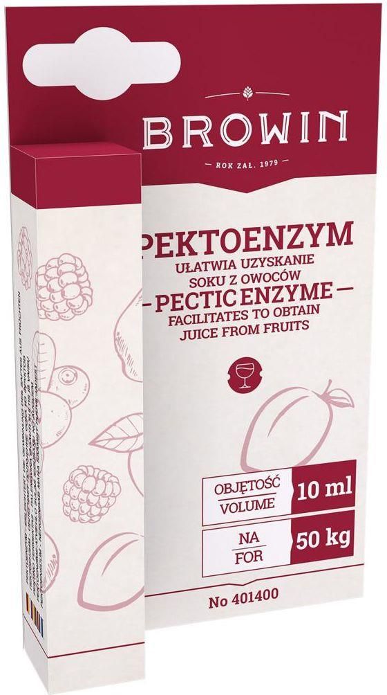PEKTOENZYM 10 ml – Enzym do Soków i Win Ułatwia Tłoczenie Klarowanie PEKTOENZYM 10 ml – więcej soku z owoców, klarowne wino, pełny smak! Domowe tłoczenie soków i przygotowywanie win jeszcze nigdy nie było tak proste! Pektoenzym to wysokiej jakości preparat enzymatyczny, który rozluźnia strukturę owoców, dzięki czemu: ⚡ Zwiększa ilość uzyskanego soku – tłoczenie staje się łatwiejsze i wydajniejsze, ⚡Ułatwia klarowanie – po fermentacji wino szybciej staje się przejrzyste, ⚡Zmniejsza lepkość płynu – napój ma idealną konsystencję, ⚡Wydajny – fiolka 10 ml wystarcza na ok. 50 kg owoców, ⚡Fiolka z zamknięciem – możesz użyć tylko części preparatu i zachować resztę na później, ⚡ Prosty w użyciu – wymieszaj z wodą, zalej owoce, odstaw – gotowe! Jak działa PEKTOENZYM Browin? Preparat rozkłada naturalne pektyny zawarte w owocach, co: ułatwia oddzielenie soku od miąższu, poprawia klarowność gotowego wina lub soku, pozwala w pełni wykorzystać owoce – bez strat smaku i aromatu. Sposób użycia Rozdrobnione owoce zalej niewielką ilością wody (1–3 L na 10 kg owoców). Dla owoców jagodowych użyj wody o temp. 40°C, a dla jabłek, gruszek, śliwek, pigwy – 80°C. Po wymieszaniu i wystudzeniu dodaj 2 ml Pektoenzymu. Przykryj i odstaw w ciepłe miejsce na 9–15 godzin. Rozpocznij tłoczenie soku lub dalszą fermentację.