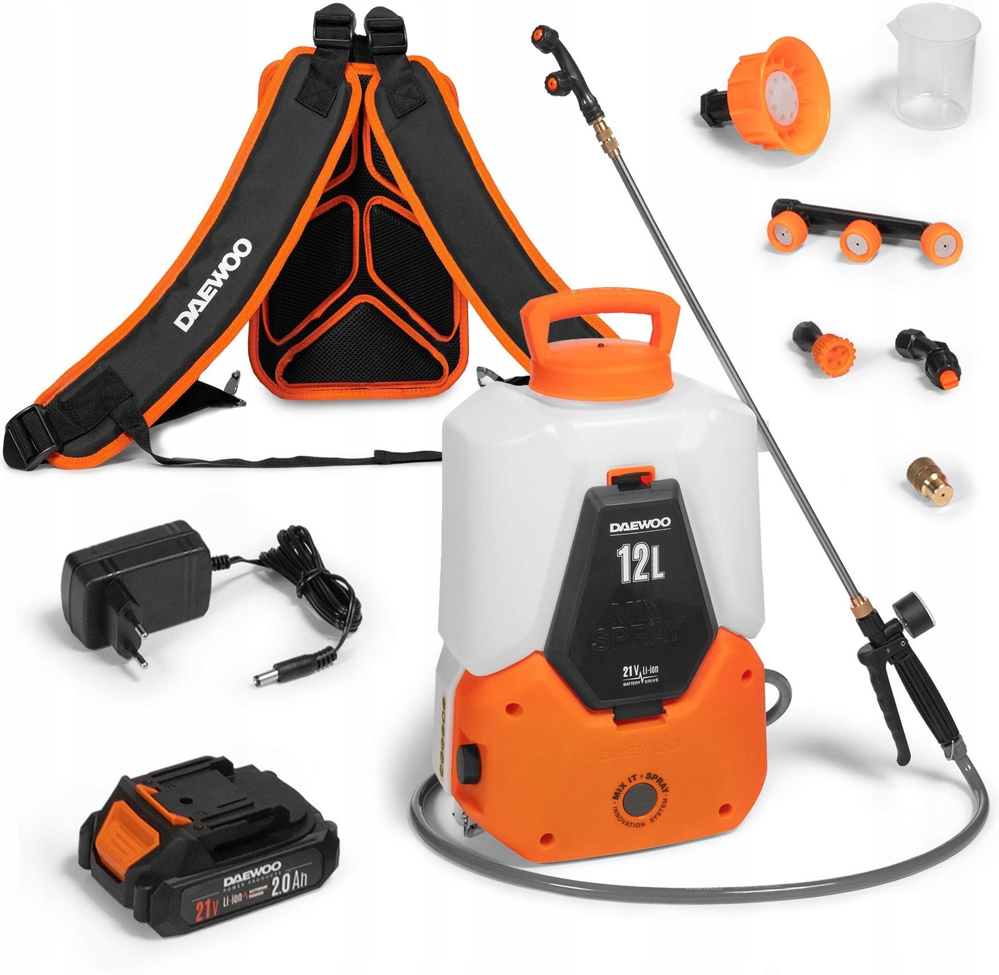 ZESTAW OPRYSKIWACZ AKUMULATOROWY + AKUMULATOR Li-Ion 21V 2.0Ah + ŁADOWARKA NR KATALOGOWY: DSA 1221LI SET Innowacyjna funkcja MIX&SPRAY – dodatkowa pompa tworzy przepływ, który miesza wodę i środki chemiczne bezpośrednio w zbiorniku opryskiwacza. Wygodny regulator z płynną regulacją ciśnienia od 1,5 do 5 barów. Wskaźniki LED poziomu naładowania baterii. Niezawodny metalowy kij teleskopowy regulowany w zakresie od 80 do 120 cm. Wąż przedłużany 150 cm. Profesjonalne paski plecakowe i miękka podkładka na plecy zapewnią komfortową, długotrwałą pracę. Szeroki otwór wlotowy z wyjmowanym filtrem. Maksymalna odległość oprysku wynosi 8 m. Uchwyt z blokadą spustu umożliwiający pracę ciągłą. W zestawie 6 dysz natryskowych i miarka. Dla łatwiejszego transportu użyj wózka DSA 100. Akumulator i ładowarka znajdują się w zestawie startowym. ZESTAW ZAWIERA Opryskiwacz Ładowarka akumulatora Akumulator litowo-jonowy 21 V 2 Ah Tyczka teleskopowa 6 dysz Miarka Filtr Paski do plecaka Instrukcja obsługi DANE TECHNICZNE Woltaż: 21 V Pojemność baterii: 2,0 Ah Objętość zbiornika: 12 litrów Przepływ: 3 l/min Odległość rozpylania: 8 metrów Maksymalne ciśnienie: 1,5-5 bar Typ baterii: Litowo-jonowy Wskaźnik naładowania baterii: Tak Długość węża: 1,5 metra Długość uchwytu: 1,2 m Ilość dysz: 6 szt. Typ pasa: pasek do plecaka Wymiary: 340x215x505 mm Waga netto: 4,1 kg Masa całkowita: 4,8 kg