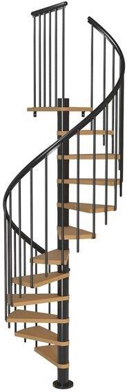 Schody spiralne Calgary o maksymalnej wysokości 280,8 cm marki Dolle. Schody spiralne to zestaw złożony z 11-stopni z podestem, konstrukcji oraz balustrady. Stopnie wykonane z lakierowanej sklejki bukowej o grubości 3,5 cm, szerokości 62,7 oraz głębokości 37-10 cm (nieregularny kształt). Średnica schodów wynosi 120 cm. System posiada także możliwość regulacji odległości pomiędzy stopniami w zakresie 20,4 cm do 23,4 cm. Schody sprzedawane są w komplecie z jednostronną balustradą z trelinkami o wysokości 95 cm, wykonaną z metalu oraz tworzywa sztucznego. Konstrukcja ma możliwość dopasowania do wysokości kondygnacji, której maksymalna wysokość wynosi 280,8 cm. Kierunek obrotu: prawoskrętne lub lewoskrętne. Minimalna wielkość otworu w stropie: 130 x 130 cm. Schody świetnie sprawdzą się zarówno w domach jednorodzinnych, jak i w mieszkaniach wielopoziomowych. Stanowią idealne wejście na adaptowany strych, poddasze, na antresole czy po prostu na piętro. Gwarancja: 5 lat