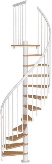 Schody spiralne Calgary o maksymalnej wysokości 280,8 cm marki Dolle. Schody spiralne to zestaw złożony z 11-stopni z podestem, konstrukcji oraz balustrady. Stopnie wykonane z lakierowanej sklejki bukowej o grubości 3,5 cm, szerokości 62,7 oraz głębokości 37-10 cm (nieregularny kształt). Średnica schodów wynosi 120 cm. System posiada także możliwość regulacji odległości pomiędzy stopniami w zakresie 20,4 cm do 23,4 cm. Schody sprzedawane są w komplecie z jednostronną balustradą z trelinkami o wysokości 95 cm, wykonaną z metalu oraz tworzywa sztucznego. Konstrukcja ma możliwość dopasowania do wysokości kondygnacji, której maksymalna wysokość wynosi 280,8 cm. Kierunek obrotu: prawoskrętne lub lewoskrętne. Minimalna wielkość otworu w stropie: 130 x 130 cm. Schody świetnie sprawdzą się zarówno w domach jednorodzinnych, jak i w mieszkaniach wielopoziomowych. Stanowią idealne wejście na adaptowany strych, poddasze, na antresole czy po prostu na piętro. Gwarancja: 5 lat