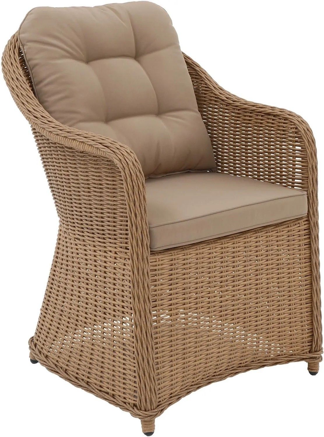 Fotel ogrodowy Maysville Fotel ogrodowy Maysville to elegancki i wygodny mebel, który doskonale sprawdzi się na tarasie, balkonie lub w ogrodzie. Połączenie solidnej konstrukcji, miękkich poduszek oraz wygodnych podłokietników zapewnia wysoki komfort użytkowania i sprzyja relaksowi na świeżym powietrzu. Ponadczasowa elegancja i styl Fotel Maysville wyróżnia się gustownym, ponadczasowym designem. Stelaż opleciony technorattanem w brązowym odcieniu nadaje fotelowi naturalny i ciepły charakter. Brązowe poduszki siedziska oraz oparcia podkreślają przytulny wygląd mebla i zachęcają do wypoczynku. Stonowana kolorystyka oraz starannie dobrane materiały sprawiają, że fotel harmonijnie komponuje się z ogrodową roślinnością. Trwała konstrukcja i praktyczne materiały Stelaż fotela wykonany został z lekkiego i trwałego aluminium, a poduszki wykonano z poliestru, który jest łatwy w czyszczeniu i przystosowany do użytkowania na zewnątrz. Wymiary - Szerokość: 57,5 cm - Głębokość: 68 cm - Wysokość: 89 cm - Wysokość siedziska: 48 cm