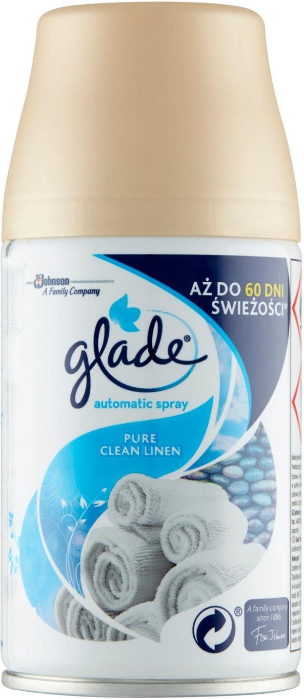 Glade Pure Clean Linen Zapas Do Automatycznego Odświeżacza Powietrza 269 Ml ❤️ GLADE ❤️ ✔️ Lubiany, przyjemny zapach świeżo wyschniętego prania zyskuje nowoczesny charakter dzięki nutom arbuza, rześkiego powietrza i musującej, cytrusowej mieszanki. aż do 60 dni świeżości Glade automatic spray - …