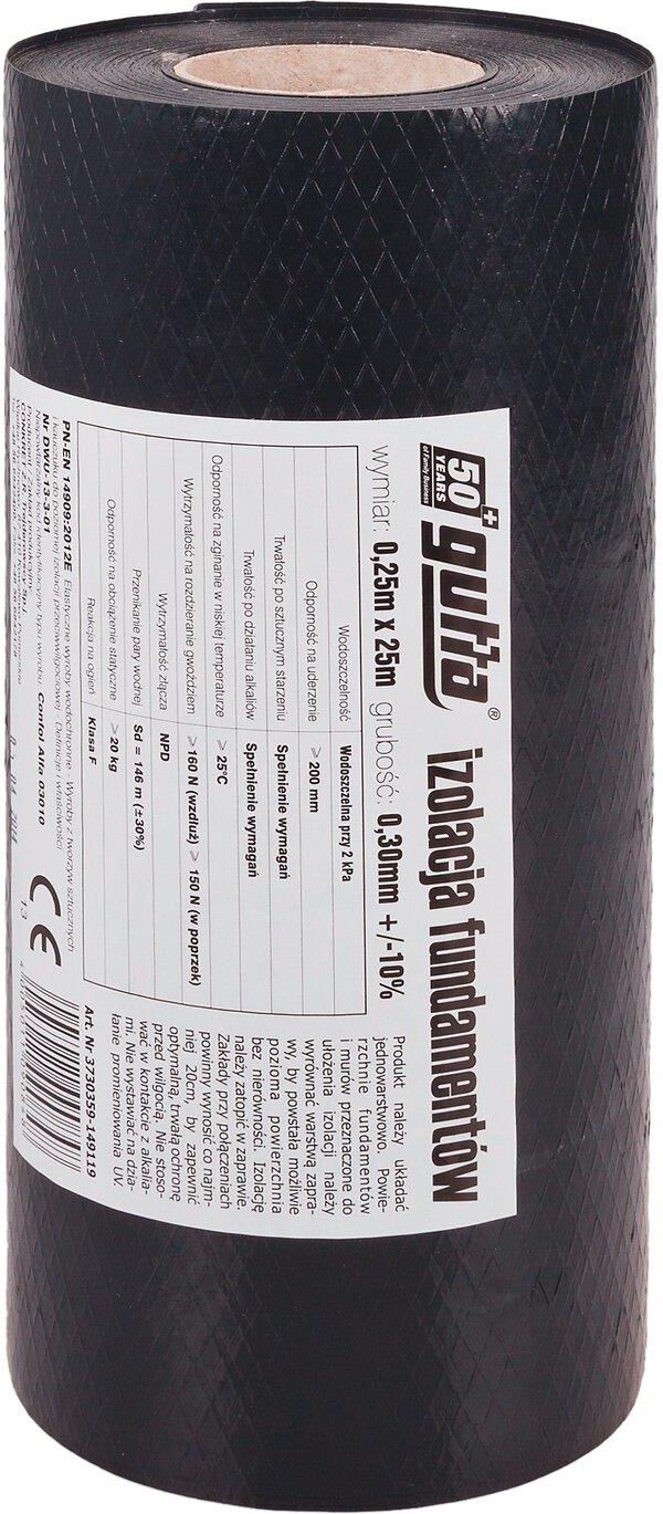 Izolacja pozioma Guttabau 25 cm x 25 m to wykonana ze specjalnej mieszanki poliolefinów membrana, zapobiegająca kapilarnemu podciąganiu wilgoci w murze. Stanowi idealną barierę przeciwwilgociową.Przeznaczona jest do izolacji poziomej murów i ław fundamentowych. Służy jako warstwa zastępująca tzw. chudy beton.Stosowana także jako izolacja pod jastrychy i wylewki oraz jako podbudowa pod rowy odwadniające.Posiada kratkowaną i chropowatą powierzchnię, umożliwiającą stabilne powiązanie folii z zaprawą.Izolacja Guttabau charakteryzuje się wytrzymałością mechaniczną. Jest odporna na ścieranie i gnicie oraz na działanie chemikaliów, a także grzybów i bakterii.