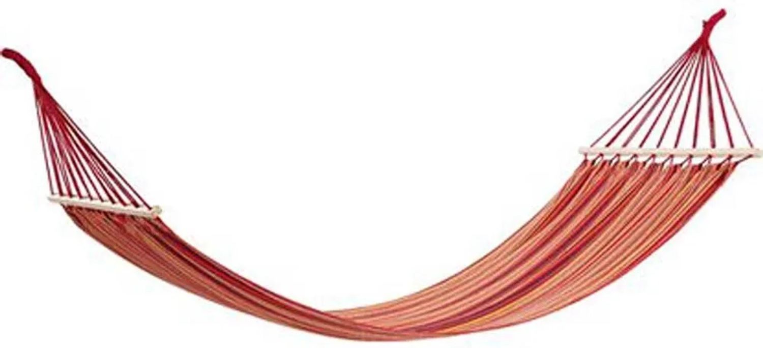 Hamak czerwono-pomarańczowy Nie ma nic przyjemniejszego niż położenie się w letnie dni na balkonie, tarasie, w ogrodzie, na patio. Hamak świetnie wpisze się również w domowe wnętrza np. w salonie, pokoju dziecięcym czy sypialni. Bardzo wytrzymały a jednocześnie niezwykle przyjemny, dzięki bawełnie, z której jest wykonany Dzięki hamakowi, stworzysz swoją perfekcyjną strefę relaksu w domu lub na łonie natury! Po sezonie hamak można w prosty sposób złożyć i przechowywać w bezpiecznym miejscu.
