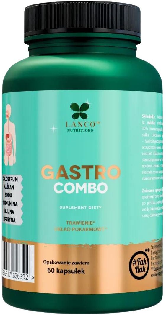 LANCO NUTRITION GASTRO COMBO 60 KAPSUŁEK COLOSTRUM MAŚLAN SODU JELITA Czego możesz się spodziewać po Gastro Combo? Wzmocnienie organizmu kombinacją colostrum, prebiotyku i postbiotyku Wspieranie odporności wrodzonej – colostrum zawiera immunoglobuliny (IgG), które wspierają pierwszą linię obrony. Korzystne działanie w obrębie przewodu pokarmowego Poprawa procesów trawienia i równowagi mikroflory. Poprawa tolerancji pokarmów i redukcja nietolerancji Składniki zalecanej dziennej porcji: Colostrum bydlęce standaryzowane na 30% immunoglobuliny IgG - 600mg, kapsułka (substancja wypełniająca – hydroksypropylometyloceluloza, oczyszczona woda), maślan sodu - 200mg, ekstrakt z kłącza ostryżu długiego standaryzowany na 90% kurkuminoidów - 200mg, inulina z cykorii OraftiⓇ - 200mg, ekstrakt z owocu pieprzu czarnego standaryzowany na 95% piperyny 2,1mg, w tym piperyna 2mg. Zalecane spożycie: Zaleca się spożywać 2 kapsułki dziennie. popijając dużą ilością wody. Nie należy przekraczać zalecanej dziennej porcji do spożycia. Jak działa Gastro Combo*? Odporność rozwija się w układzie pokarmowym, ponieważ jelita zawierają znaczne ilości komórek odpornościowych i mikrobiotu, które są kluczowe dla prawidłowego funkcjonowania układu immunologicznego Gastro Combo może wspomagać utrzymanie integralności bariery jelitowej, co bywa szczególnie istotne w przypadku osób z problemami jelitowymi, nieszczelnością, czy stanami obniżonej odporności Mikrobiota jelitowa wpływa na rozwój komórek odpornościowych, ich stymulację i produkcję przeciwciał, a także na utrzymanie bariery jelitowej. Składniki Gastro Combo mogą promować rozwój korzystnych bakterii jelitowych, oraz ograniczać namnażanie patogennych drobnoustrojów. Układ odpornościowy przewodu pokarmowego odgrywa istotną rolę w odporności miejscowej (np. chroni jelita przed infekcjami) i ogólnej (np. wpływa na ogólny stan odporności organizmu) Kombinacja 5 składników w celu wzmocnienia działania Colostrum to światowy bestseller z udowodnionym naukowo działaniem zwiększającym odporność wrodzona Colostrum zawiera immunoglobuliny i laktoferynę - przeciwciała i białka, które wspierają układ odpornościowy Kwas masłowy w formie maślanu sodu i colostrum działają synergicznie wspierając zdrowie układu pokarmowego. Dowiedziono, że maślan sodu regeneruje nabłonek jelitowy, naprawiając uszkodzenia i zwiększając jego barierę ochronną Kurkumina i piperyna to dziesiątki lat badań klinicznych i udowodnionego działania przeciwzapalnego, trawiennego i wspomagającego wchłanianie pozostałych składników Inulina jest prebiotykiem, który stanowi pożywienie dla korzystnych bakterii jelitowych, co w połączeniu z postbiotykiem (maślan sodu) znacznie potęguje działanie preparatu Nie należy przekraczać zalecanej porcji do spożycia w ciągu dnia. Suplement diety nie może być stosowany jako substytut zróżnicowanej diety. Prowadzenie zdrowego trybu życia i stosowanie zrównoważonej diety są niezbędne dla zachowania dobrego stanu zdrowia. Nie stosować u dzieci, kobiet w ciąży i w trakcie laktacji. Przechowywać w sposób niedostępny dla małych dzieci, w suchym i chłodnym miejscu.