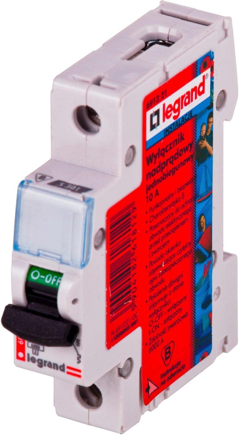 Wyłącznik nadprądowy jednobiegunowy S-301 B 10 A marki Legrand stosowany jest w instalacji elektrycznej do 1 kV. Służy do ochrony obwodów oświetleniowych, gniazd wtykowych i sterowania przed przeciążeniem i zwarciem.Wyłącznik posiada przezroczyste okienko, w którym można zamieścić czytelny opis zabezpieczonego obwodu. Pozwala na prosty i wygodny montaż wyposażenia dodatkowego: styków pomocniczych, wyzwalaczy i zdalnego sterowania.Znamionowa zwarciowa zdolność łączeniowa wyłącznika wynosi 6 kA, według normy EN 60898.Prąd znamionowy: 10 A. Szerokość w modułach 17,5 mm: 1.