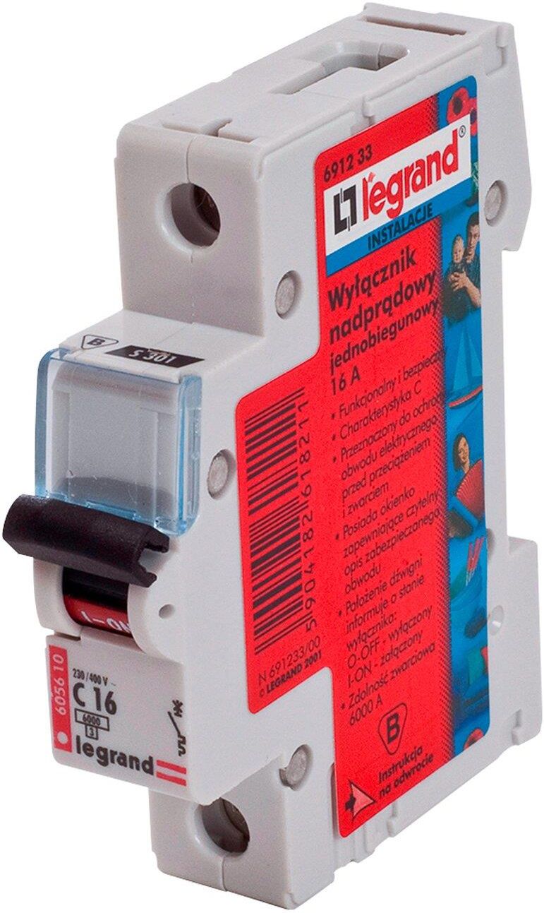 Wyłącznik nadprądowy jednobiegunowy S-301 C 16 A marki Legrand stosowany jest w instalacji elektrycznej do 1 kV. Służy do ochrony obwodów urządzeń elektroenergetycznych o dużych prądach rozruchowych (np. silniki i transformatory) przed przeciążeniem i zwarciem.Wyłącznik posiada przezroczyste okienko, w którym można zamieścić czytelny opis zabezpieczonego obwodu. Pozwala na prosty i wygodny montaż wyposażenia dodatkowego: styków pomocniczych, wyzwalaczy i zdalnego sterowania.Znamionowa zwarciowa zdolność łączeniowa wyłącznika wynosi 6 kA, według normy EN 60898.Prąd znamionowy: 16 A. Szerokość w modułach 17,5 mm: 1.