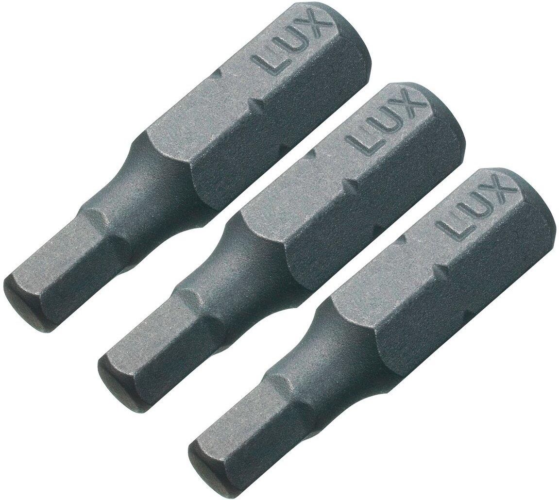 Zestaw końcówek do śrub imbusowych, LUX-TOOLS, 3-elementowy.Bardzo wytrzymałe końcówki o długości 25 mm są przeznaczone do śrub z łbem walcowym o gnieździe sześciokątnym. Mogą być stosowane z typowymi uchwytami do końcówek: 6,3 mm (1/4"). Zestaw zawiera po jednym bicie imbusowym 2 mm, 3 mm oraz 4 mm. Jest idealny dla majsterkowiczów.