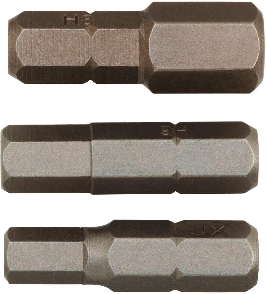 Zestaw końcówek do śrub imbusowych, LUX-TOOLS, 3-elementowy.Bardzo wytrzymałe końcówki o długości 25 mm są przeznaczone do śrub z łbem walcowym o gnieździe sześciokątnym. Mogą być stosowane z typowymi uchwytami do końcówek: 6,3 mm (1/4"). Zestaw zawiera po jednym bicie imbusowym 5 mm, 6 mm oraz 8 mm. Jest idealny dla majsterkowiczów.
