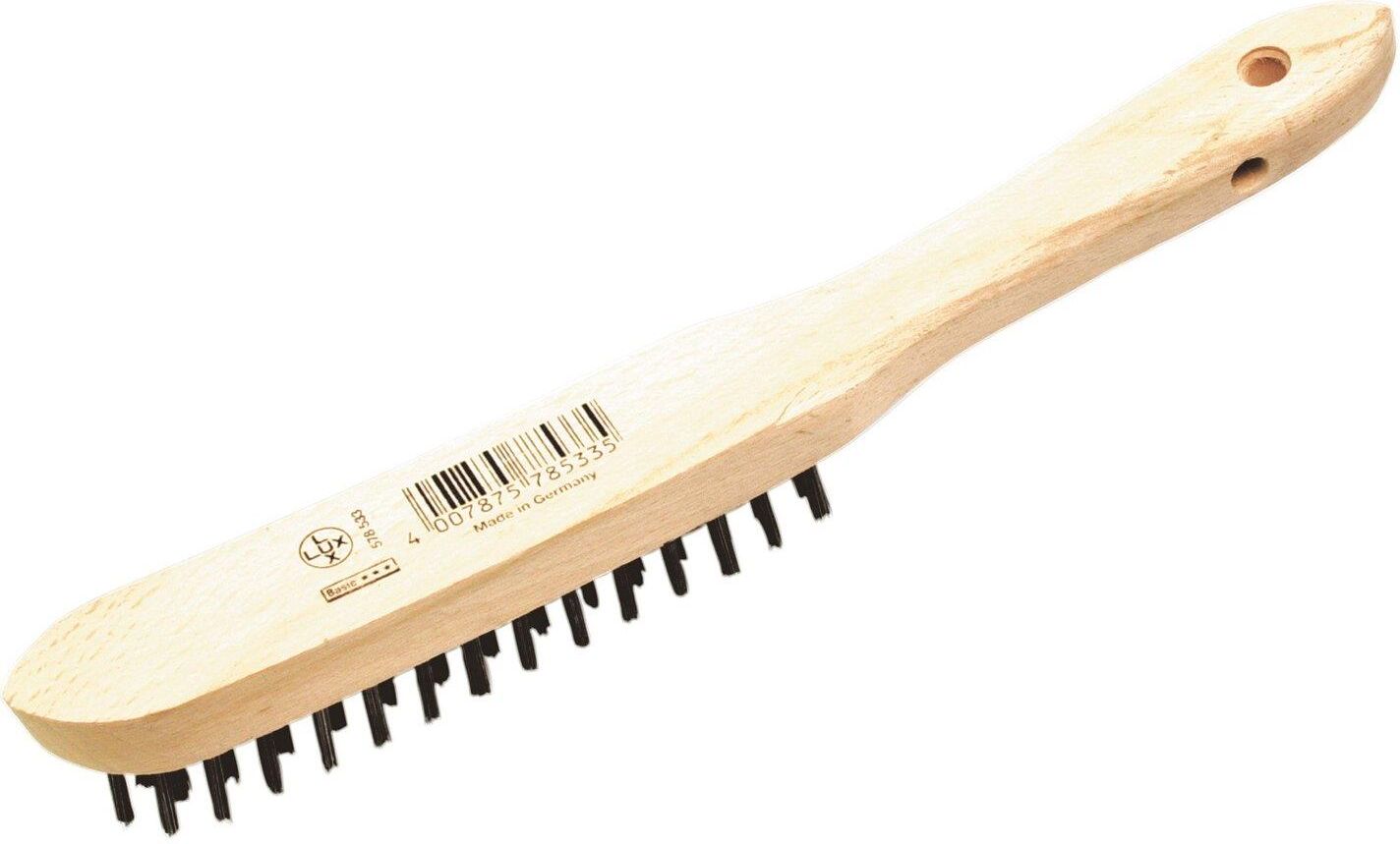 Szczotka druciana ręczna, 3-rzędowa, LUX-TOOLS.Wykonana z hartowanego stalowego drutu w drewnianej oprawce. Służy do usuwania rdzy i powłok lakierniczych oraz do czyszczenia elementów drewnianych i metalowych. Posiada uchwyt z otworem, umożliwiającym zawieszenie.Profesjonalna jakość zapewnia dużą wydajność ścierania i tym samym wysoką trwałość narzędzia.
