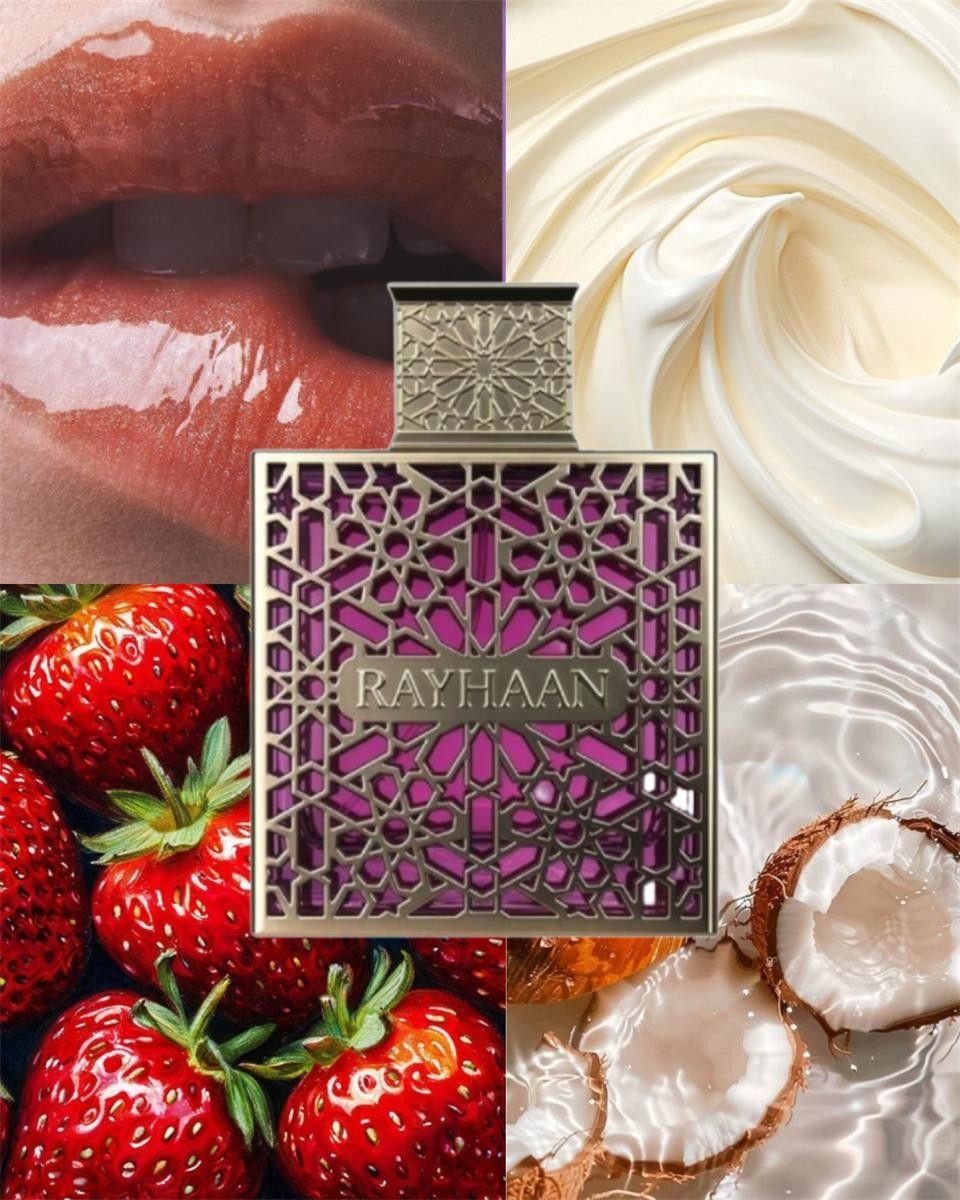 RAYHAAN KISS 100ML WODA PERFUMOWANA DLA KOBIET PERFUMY ARABSKIE Nuty zapachowe: Nuty głowy: Truskawka, Malina, Kokos, Pralina Nuty serca: kwiat pomarańczy, mleko skondensowane, karmel, delikatne białe kwiaty Nuty bazy: wanilia, tonka, drzewo sandałowe, piżmo ✨Rayhaan Kiss – Eau de Parfum – …