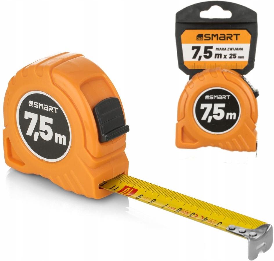 SMART365 SM-58-10075 Miara zwijana 7,5m x 25 mm Cechy produktu Wysokiej jakości stalowa taśma o zwiększonej grubości poprawia sztywność i wydłuża żywotność. Czytelna podziałka w drugiej klasie dokładności zapewnia zawsze dokładny pomiar. Wytrzymała obudowa z ABS-u chroni miarę w razie upadku. Precyzyjny mechanizm ułatwia rozwijanie, a mocna sprężyna zwijanie miary. Dane techniczne Długość: 7,5 m Szerokość taśmy: 25 mm Grubość taśmy: 0,155 mm Dokładność pomiaru: II klasa dokładności