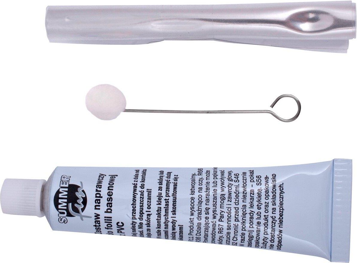 Zestaw naprawczy do basenów Summer Fun.Składa się z tubki kleju, który spaja nawet pod wodą i łaty. Umożliwia szybkie załatanie dziurawej folii w basenie, stawie ogrodowym czy w oczku wodnym.Zestaw jest również idealny do naprawy uszkodzonych akcesoriów dmuchanych jak materace, pontony czy zabawki plażowe.Skutecznie załata także dziury i pęknięcia w zasłonach prysznicowych, łodziach, foliach przeciwdeszczowych, namiotach, parasolach itp.Wielkość łaty można dowolnie regulować, wycinając nożyczkami odpowiedni fragment.