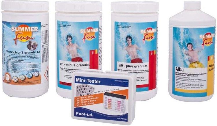 Zestaw startowy Starter Set marki Summer Fun przeznaczony jest do pielęgnacji wody we wszystkich rodzajach basenów.Składa się z 6 elementów, które zapewniają odpowiednią regulację pH, dezynfekcję, koagulację, zwalczają glony i pomagają w utrzymaniu czystości.