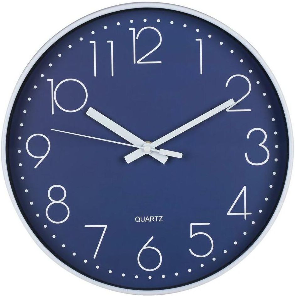 Zegar ścienny Blue o średnicy 30 cm niebiesko-biały Estetyczny zegar ścienny o wyraźnej, czytelnej tarczy to uniwersalny dodatek do aranżacji kuchni, salonu, gabinetu czy innego pomieszczenia. Wysoka jakość oraz estetyka wykonania gwarantują, że świetnie sprawdzi się w pokoju nastolatka. Zegar zasilany jest baterią AA 1,5 V - do kupienia osobno. Średnica zegara: 30 cm