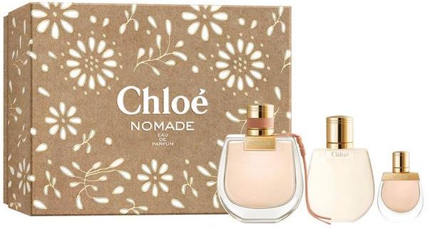 Chloe, Nomade, zestaw: woda perfumowana 75 ml, perfumowane mleczko do ciała 100 ml, woda perfumowana 5 ml Zestaw zapachowy Nomade od marki Chloe. W skład zestawu wchodzi woda perfumowana, miniatura wody perfumowanej oraz balsam do ciała. Nomade to kwiatowo-szyprowa kompozycja, dedykowana śmiałym i oryginalnym kobietom. Zapach otwierają tętniące energią nuty mirabelki i bergamotki. Tuż za nimi podążają kwiatowe nuty serca i delikatnej bazy, skrywającej w sobie kremowe akcenty frezji i mchu dębowego. Nuty zapachowe: Nuta głowy: bergamotka, cytryna, pomarańcza, mirabelka Nuta serca: frezja, jaśmin, brzoskwinia, róża Nuta bazy: mech dębowy, drzewo bursztynowe, paczula, drzewo sandałowe, białe piżmo