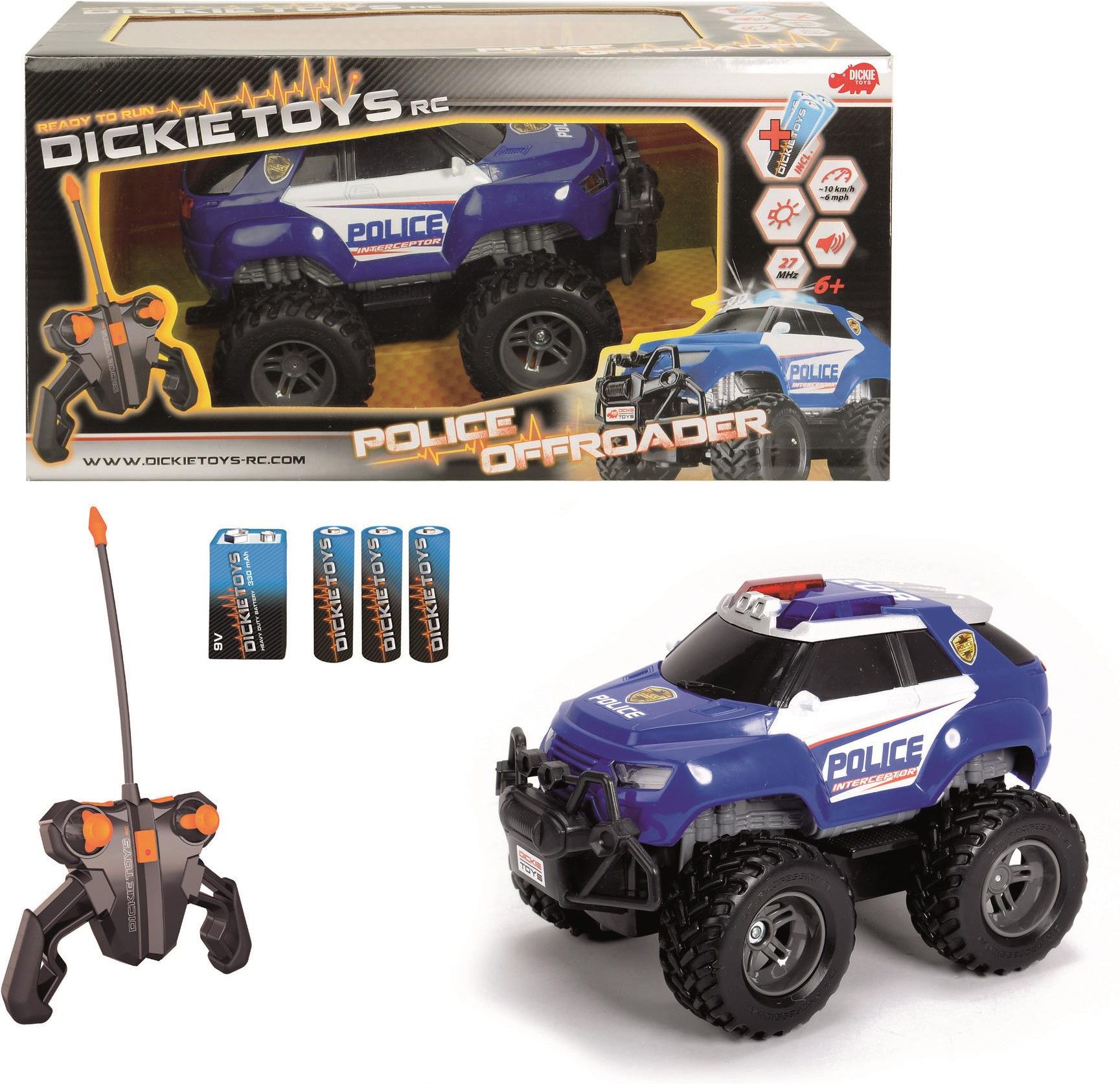 DICKIE Zdalnie sterowany Terenowy pojazd Policyjny Offroader RC Zdalnie sterowany terenowy policyjny radiowóz Offroader posiada dwukanałowy bezprzewodowy nadajnik radiowy pracujący w częstotliwości 27 Mhz. Auto zostało wyposażone w migające światła, potrafi także odtwarzać dźwięki. Policyjna syrena oraz koguty włączają się podczas jazdy do przodu. Prędkość maksymalna to 10km/h. Z tyłu terenówki znajduje się zaczep do holowania a gumowe koła zapewniają doskonałą przyczepność. Pojazd wykonany w skali 1:24 Zasilanie bateriami: 1 x 9V 6F22 oraz 3 x 1,5V LR6 (baterie znajdują się w zestawie) dł. 19 cm od 6 lat