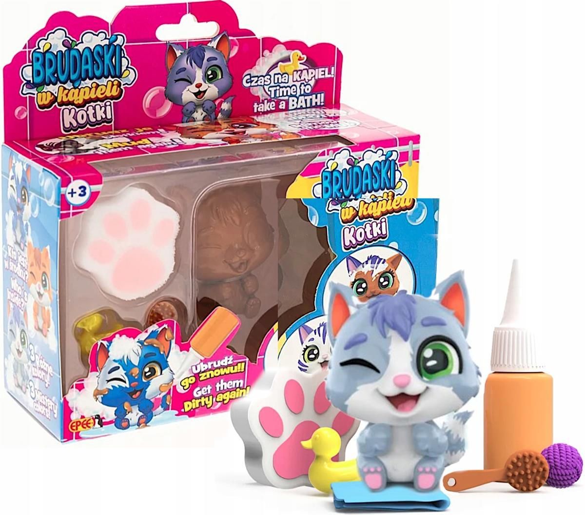 Brudaski w kąpieli Kotki Zestaw Bonusowy Kotek Puszek błotko akces EPEE Brudaski w Kąpieli – Kotki to wyjątkowa kolekcja figurek, które można brudzić specjalnym błotkiem, myć i zaczynać zabawę od nowa! Każdy kotek ma specjalną powłokę, dzięki której brudek znika w mgnieniu oka, a dołączone akcesoria sprawiają, że kąpiel staje się jeszcze ciekawsza. Jak to działa? Ubrudź kotka specjalnym błotkiem – zobacz, jak zmienia wygląd! Użyj dołączonych akcesoriów, by go umyć – gąbeczka i szczotka pomogą w kąpieli. Osusz i przytul czystego kotka – a potem… znów zacznij zabawę od początku! Dlaczego Brudaski w Kąpieli to hit? Interaktywna zabawa – brudzenie i mycie kotka to nieskończona frajda! Rozwija wyobraźnię i zdolności manualne – dzieci mogą tworzyć własne historie i wcielać się w rolę opiekunów zwierzątek. Zachęca do dbania o higienę – zabawa w kąpanie kotków uczy troski o czystość w naturalny sposób. Idealny prezent – dla małych miłośników zwierzątek i kreatywnej zabawy! Zawartość zestawu 1 figurka kotka – do wyboru 9 różnych bohaterów: Fiołek, Tytus, Puszek, Lusia, Tofik, Łatek, Lili, Karmelek, Rózia 1 tubka z błotkiem – do zabawy w brudzenie kotka 5 akcesoriów kąpielowych: gąbeczka, szczotka, kaczuszka, kłębek, ręczniczek Brudne łapki? Czyste futerko? A może znów kąpiel? Niezliczone możliwości zabawy czekają! Wymiary opakowania: 15 x 15 x 6 cm Wiek: 3+