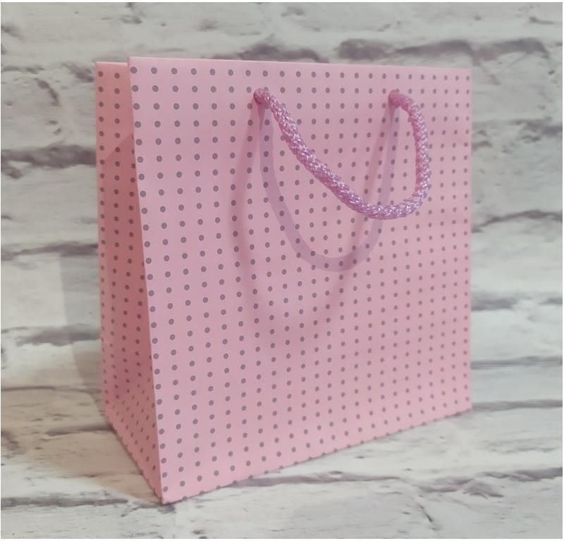 - torebka prezentowa - wzór: różowa, fioletowe kropki - wymiary: 15.5 x 15.5 x 8 cm