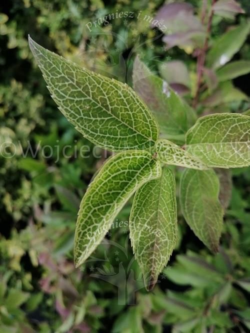 Forsycja zielona Kumson-Forsythia viridissima Forsycja zielona "Kumson" - Forsythia viridissima (pojemnik C2) uderzająco ornamentalne liście są niewątpliwie najcenniejszą cechą tej odmiany – liście są pokryte białymi nerwami, co skutkuje wyglądem podobnym do mozaiki – najbardziej unikalna odmiana …