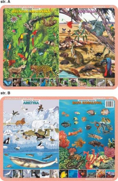 Podkładka edukacyjna: Zwierzęta w różnych środowiskach Odkryj fascynujące światy różnorodnych środowisk na Ziemi, dzięki edukacyjnej podkładce z serii Visual System! Ta niezwykła podkładka przedstawia cztery unikalne ekosystemy, w których żyją niezwykle interesujące zwierzęta:Amazonia: życie w dżungli Dżungla amazońska to jedno z najbardziej różnorodnych środowisk na świecie, zamieszkane przez wiele egzotycznych stworzeń. Na tej części podkładki zobaczysz, jak wyglądają i jak żyją zwierzęta Amazonii.Australia: kontynent pełen wyjątkowych stworzeń Australia to jedyny kontynent zamieszkany jedynie przez zwierzęta występujące tylko na tym obszarze. Obejrzyj nietypowe żyjątka, które sprawują dominację na tym kontynencie.Arktyka: przetrwanie w zimnych rejonach Arktyka to lodowaty region, w którym życie jest niezwykle trudne. Mimo to, możemy tam spotkać wiele zwierząt, które przystosowały się do surowych warunków i tam właśnie żyją i rozmnażają się.Rafa koralowa: kolorowy świat podwodnych gatunków Rafy koralowe to jedne z najbardziej barwnych środowisk na naszej planecie, zamieszkane przez mnóstwo różnorodnych gatunków. Na podkładce możemy podziwiać ten tętniący życiem, podwodny świat. EAN: 5903111525330