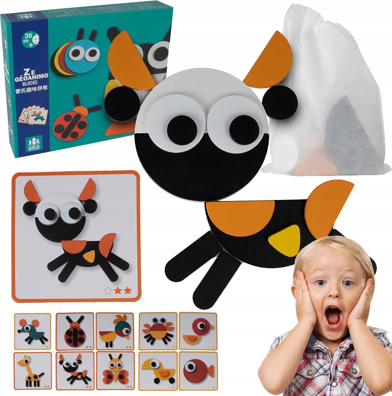 UKŁADANKA KLOCKI EDUKACYJNE DREWNIANE ZWIERZĄTKA Parametry Opakowanie: 21,5 x 25,5 x 5,0 cm Drewniane klocki: 29 sztuk 20 kart przedstawiających zwierzątka materiałowy woreczek do przechowywania 24,5 x 19,0 cm Wiek: 3+ Pozwól swojemu dziecku uczyć się poprzez zabawę! Zestaw drewnianych klocków w różnych kształtach i żywych kolorach to niekończące się możliwości zabawy!Solidnie wykonana zabawka zapewni Twojemu dziecku godziny rozrywki. WSPANIAŁA ZABAWA NA WIELE GODZIN W pudełku znajdziemy 20 kart, które pozwolą nam stworzyć 20 różnych zwierzątek oraz materiałowy woreczek do przechowywania. Pozwól dziecku układać puzzle patrząc na kartę, a potem bez podpowiedzi. Dodatkowo na kartach znajdują się gwiazdki od 1 – 3 ukazujące poziom trudności ułożenia danego zwierzątka.Pozwól rozwinąć kreatywność swojego dziecka!Baw się razem ze swoim dzieckiem.